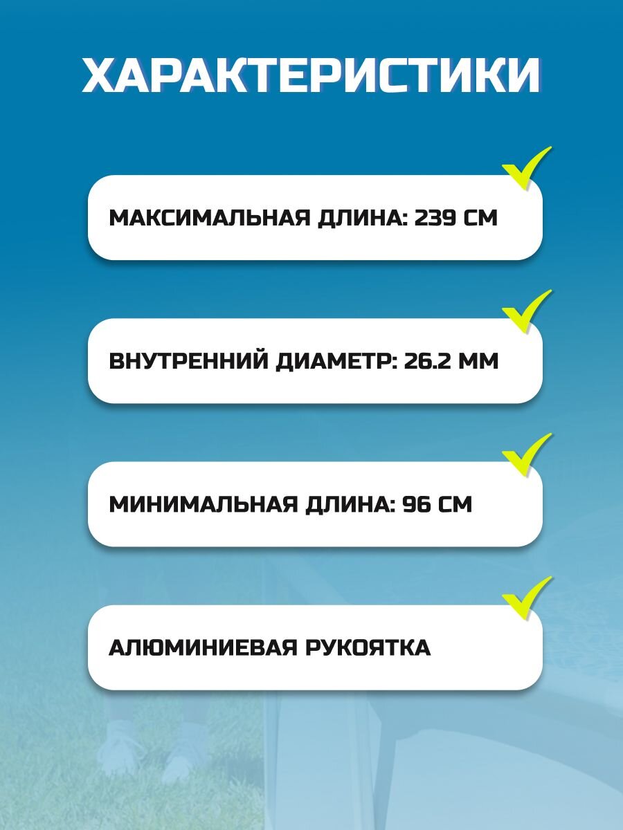Держатель изготовлен из прочного алюминия, что гарантирует долговечность и надежность в использовании. Телескопическая конструкция позволяет регулировать длину ручки от 96 до 239 см, что делает его подходящим для бассейнов различных размеров. Внутренний диаметр составляет 26.2 мм, а два наружных диаметра - 3 и 3.5 см.