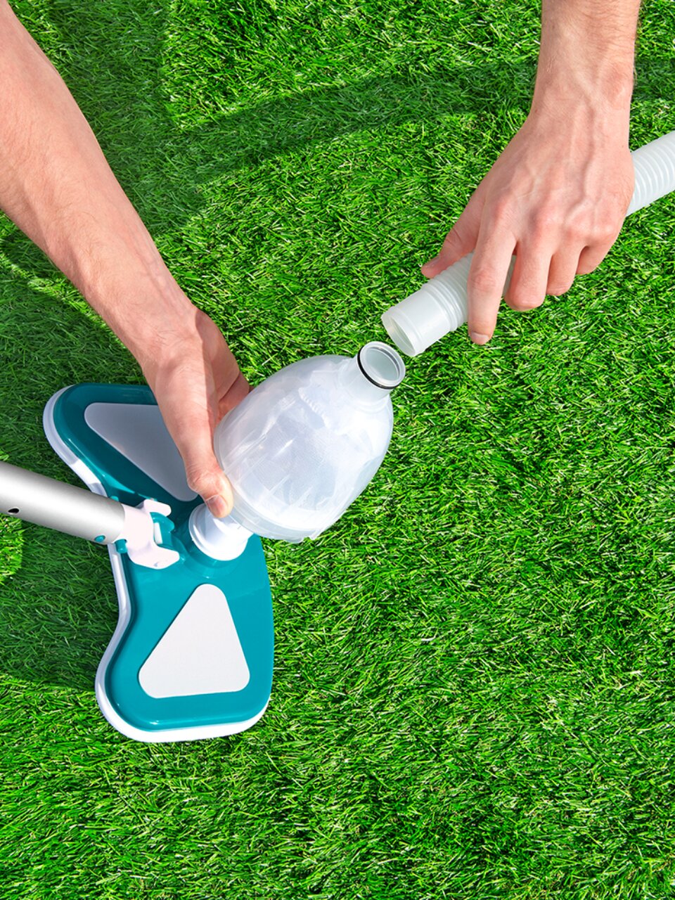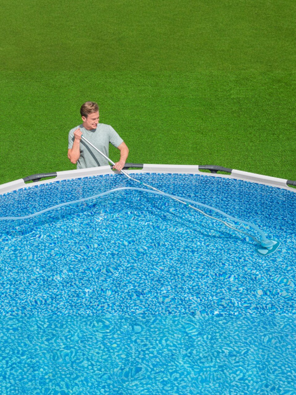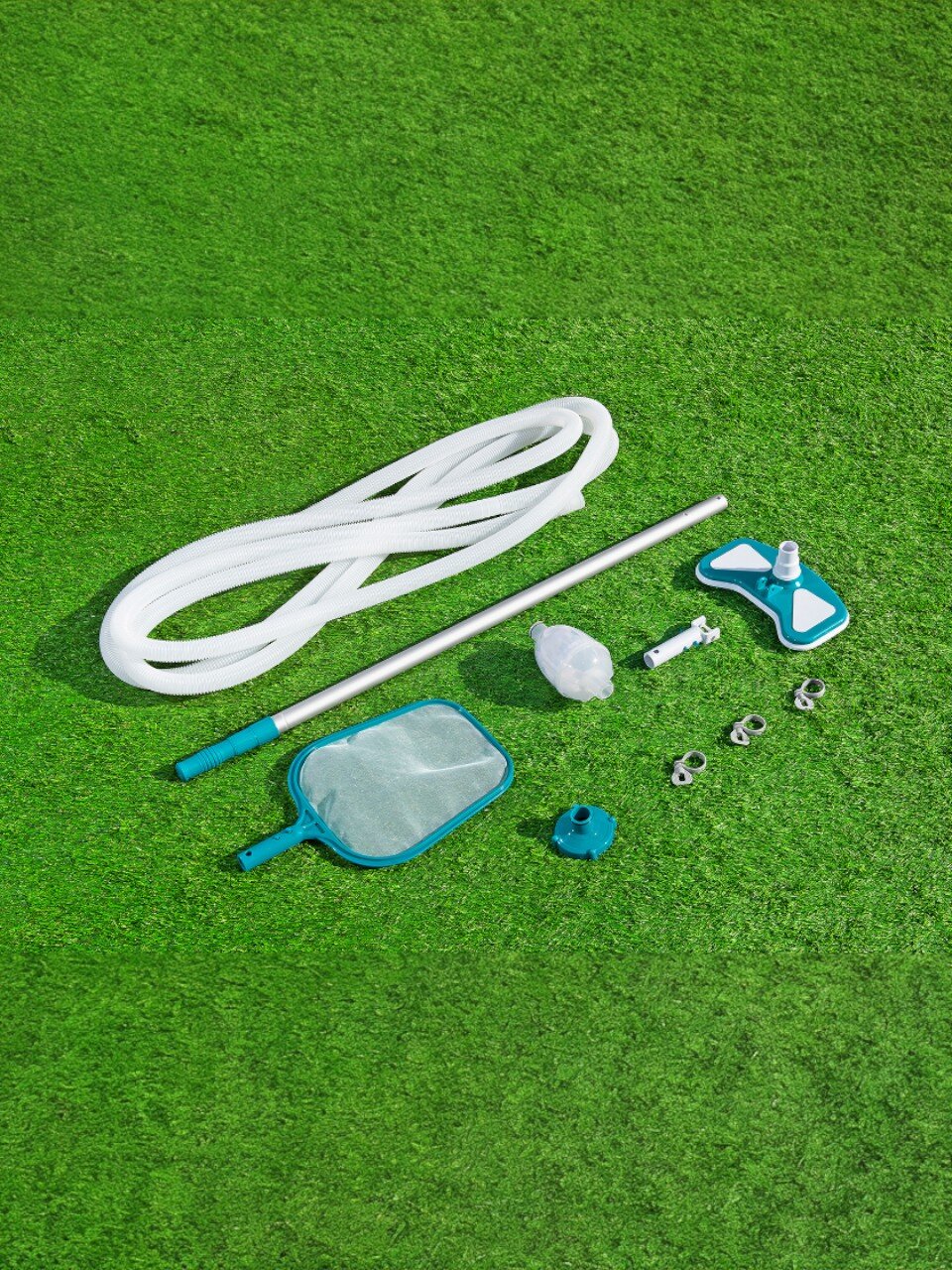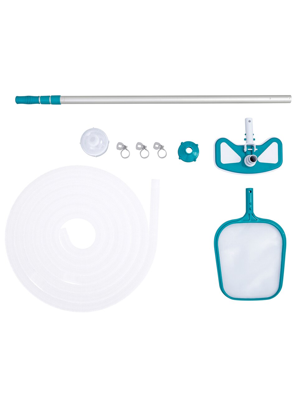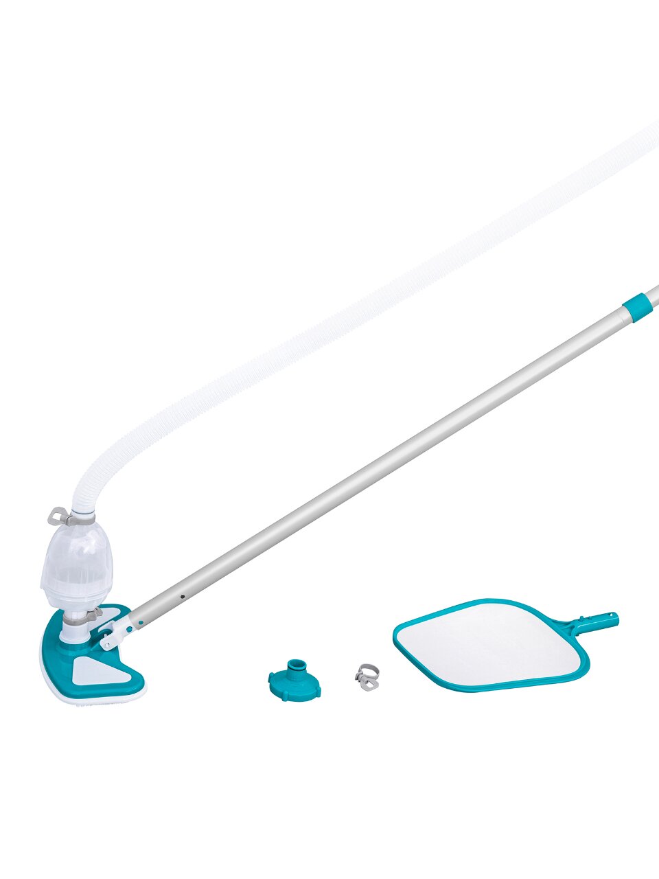 Набор включает в себя все необходимое для полноценной чистки: сборная штанга, шланг диаметром 32 мм с адаптером для внутренней части бассейна, вакуумная насадка для очистки поверхности под водой и насадка сетка (сачок). Изготовленные из высококачественных материалов, таких как алюминий и пластик, элементы комплекта гарантируют долговечность и устойчивость к воздействию воды и химических средств.