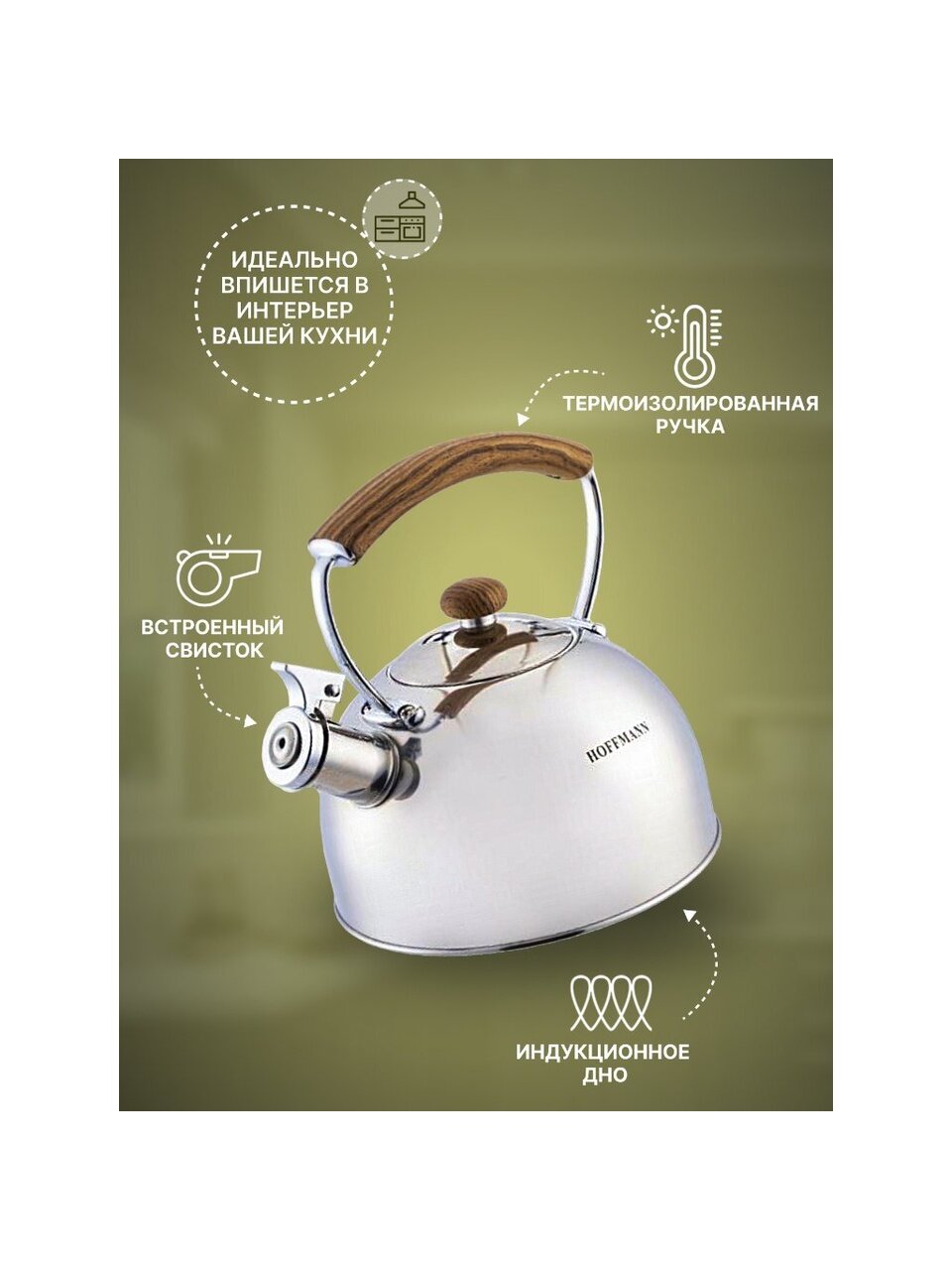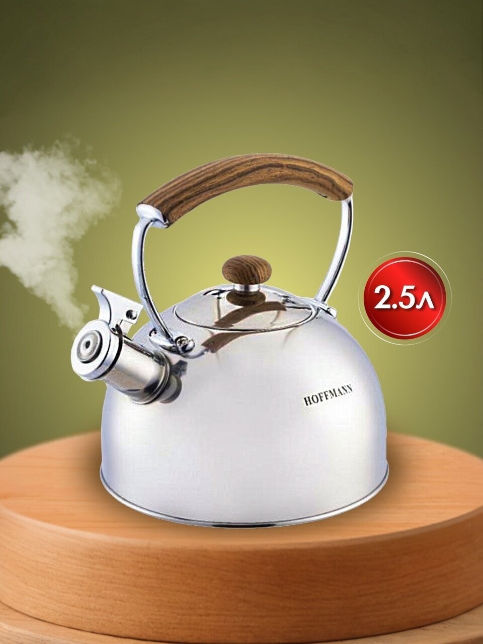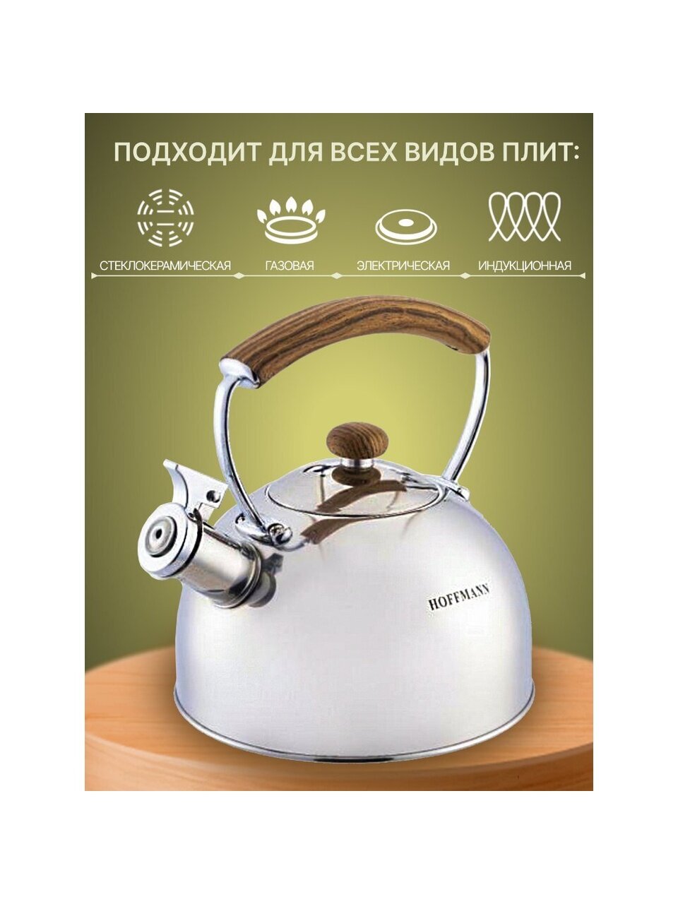 Чайник Hoffmann 2.5 л из нержавеющей стали для индукции — надежный выбор для дома и дачи, быстро закипает, не перегревается, стильная коричневая ручка.