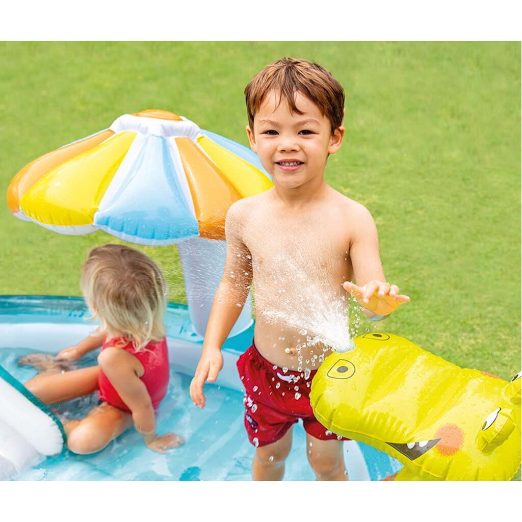 Детский бассейн с фонтаном станет любимым местом для игр у вашего ребенка! Он включает в себя водную горку, теневой навес "Грибок", разбрызгиватель "Крокодильчик", круг-уточку и надувное ведерко. Красочный дизайн приглянется как девочкам, так и мальчикам. К игровому центру бассейну можно подключить обычный шланг, и тогда на носу крокодила включится забавный фонтан, который освежит в жаркую погоду! Специальный коврик у подножия горки обеспечит мягкое и комфортное приземление при катании с нее. Дети с удовольствием будут плескаться в воде и кататься с горки, поднимая каскад брызг и наслаждаясь летними забавами.