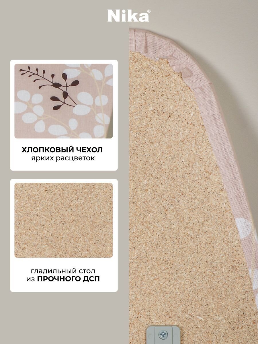 Гладильная доска Nika Лина 4 с рабочей поверхностью из ДСП и чехлом из хлопка – отличный вариант для ежедневного использования. Изделие оснащено выдвижным подутюжником и съёмным подрукавником.