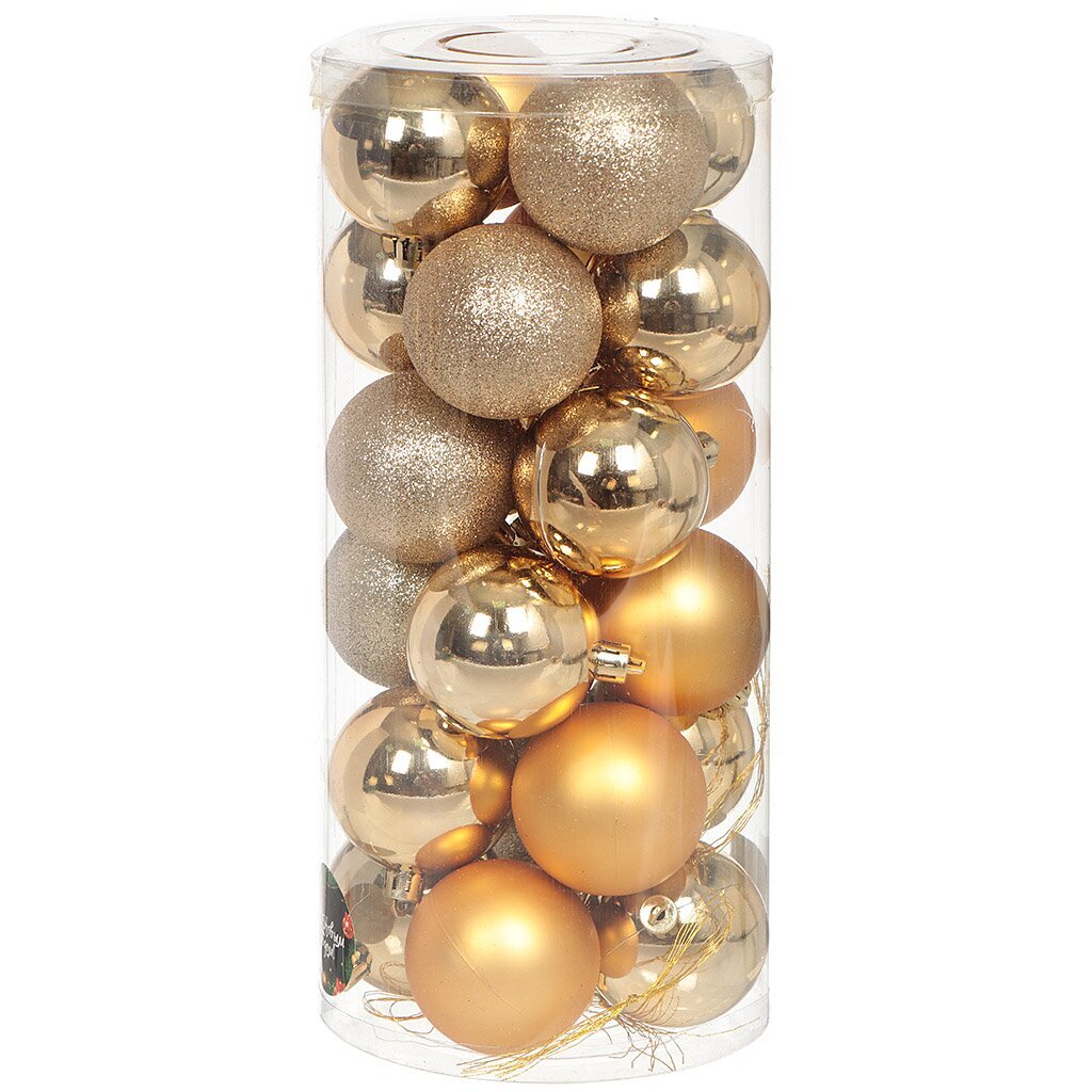 В комплекте 24 шара диаметром 6 см, все в едином золотом цвете с блестящим покрытием, на удобной подвеске.