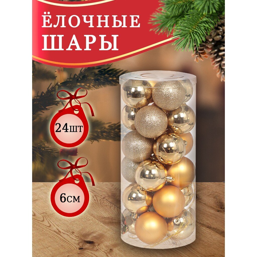 Елочные шары 24 шт, золото, 6 см – стильный набор для эффектного декора дома, дачи или офиса. Безопасный пластик, блестящее покрытие, небьющиеся – идеальный выбор для семей с детьми.