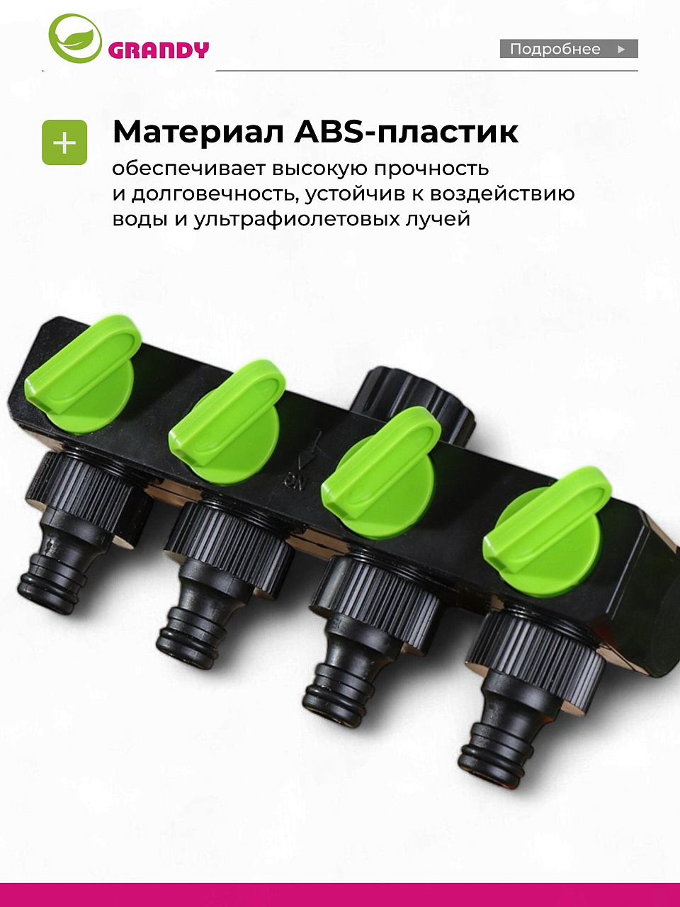 Представляем инновационный распределитель для шланга 4-х канальный от бренда Grandy, модель JS-349. Этот продукт станет незаменимым помощником в создании идеальной системы полива на вашем участке. Изготовленный из прочного ABS-пластика, распределитель гарантирует долговечность и надежность в использовании. Благодаря быстросъемной конструкции, установка и демонтаж выполняются за считанные минуты, что значительно упрощает процесс эксплуатации.