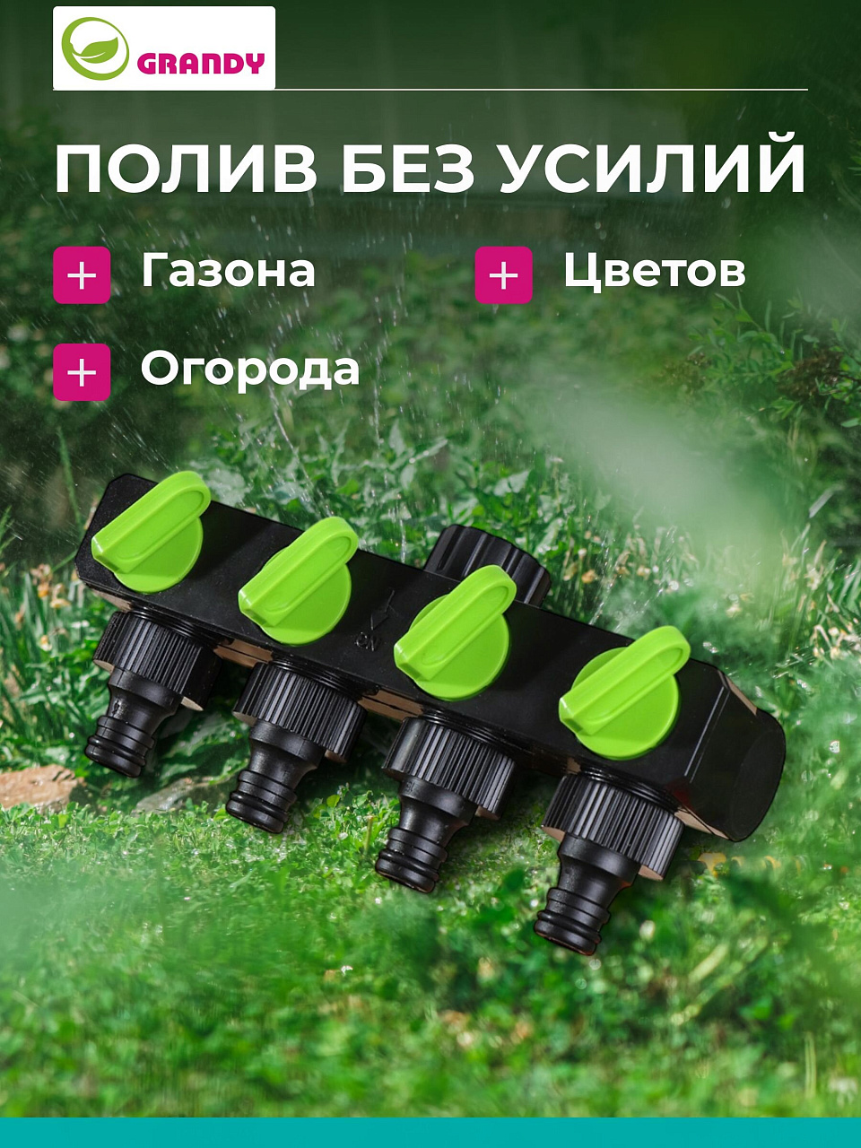 Ключевой особенностью этого распределителя является возможность регулировки подачи воды, что позволяет гибко настраивать интенсивность полива в зависимости от потребностей растений. Подключение осуществляется на кран с наружной резьбой 3/4", что делает его совместимым с большинством стандартных систем. Страна продавца – Китай, гарантия качества от производителя Grandy.