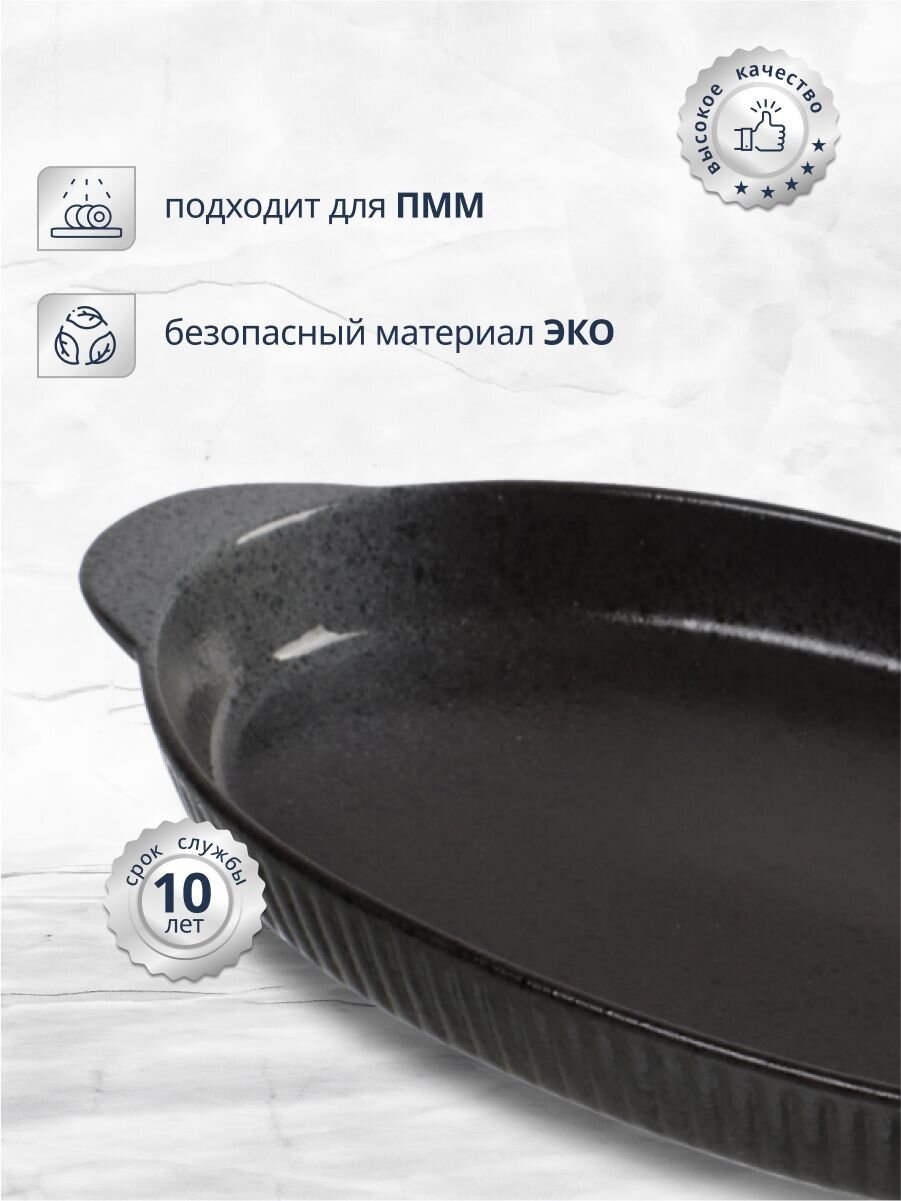 - Практичные размеры: вместимость 0.7 л, оптимальная глубина 2.5 см и овальная форма позволяют готовить порционные блюда или небольшие запеканки для семьи.