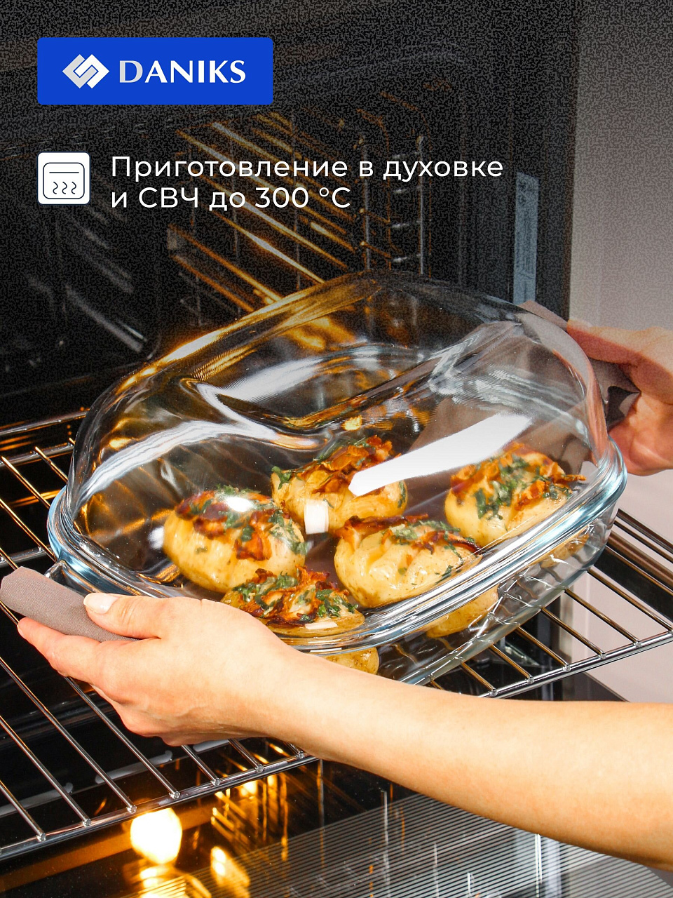 Кастрюля из жаропрочного стекла Daniks 5,7 л с крышкой: удобно готовить курицу, рыбу, пироги для всей семьи. Подходит для духовки и СВЧ, легко мыть.