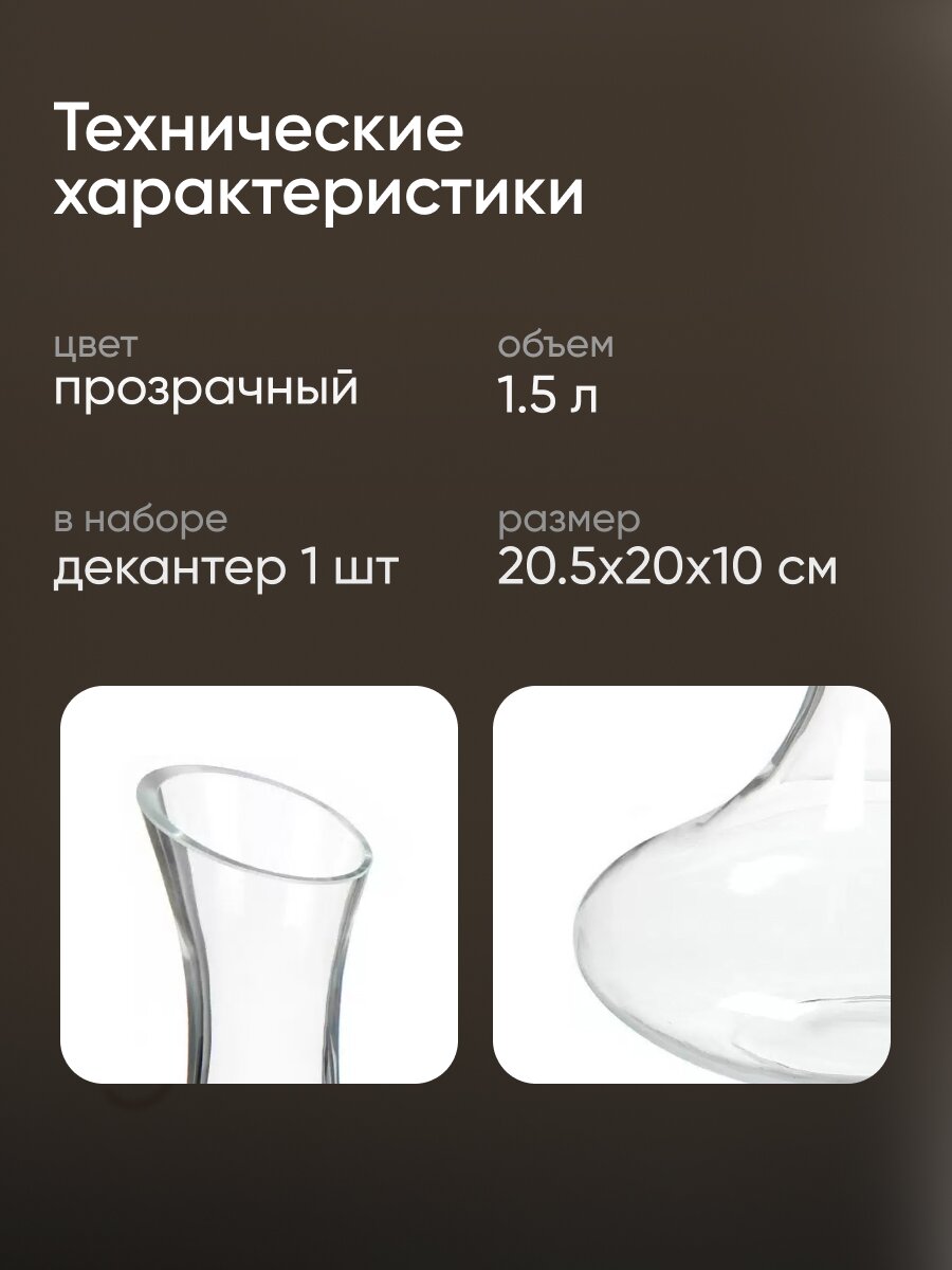 Декантер станет незаменимой вещью в доме настоящего ценителя вина. Он позволит убрать осадок в зрелом вине или насытит кислородом молодое, что позволит насладиться всеми оттенками вкуса виноградного напитка. Декантер с вином будет особенно эффектно смотреться за вашим столом и позволит полюбоваться цветом благородного напитка.