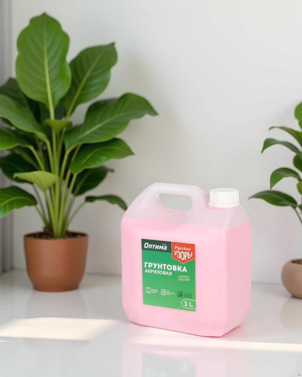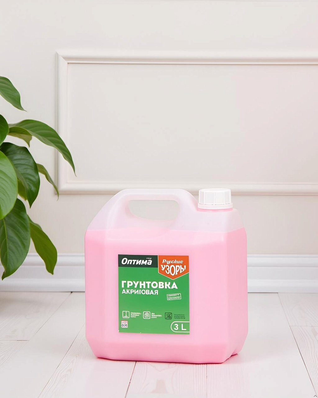 Грунтовка на акриловой основе Русские узоры используется для пропитки фасадов и оснований в интерьере перед нанесением последующих слоев – краски, клея, штукатурки, наливных полов.