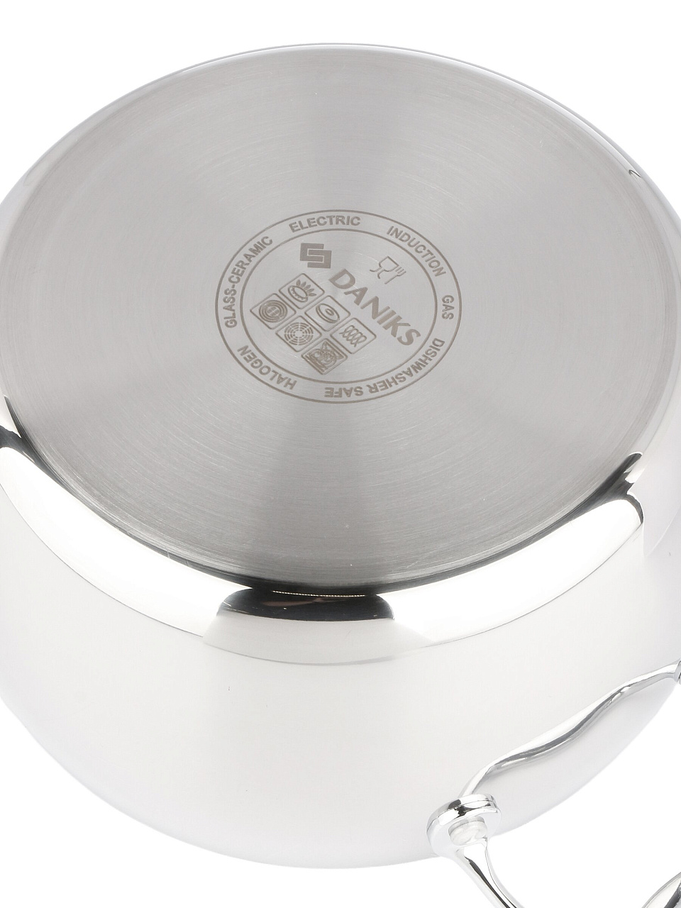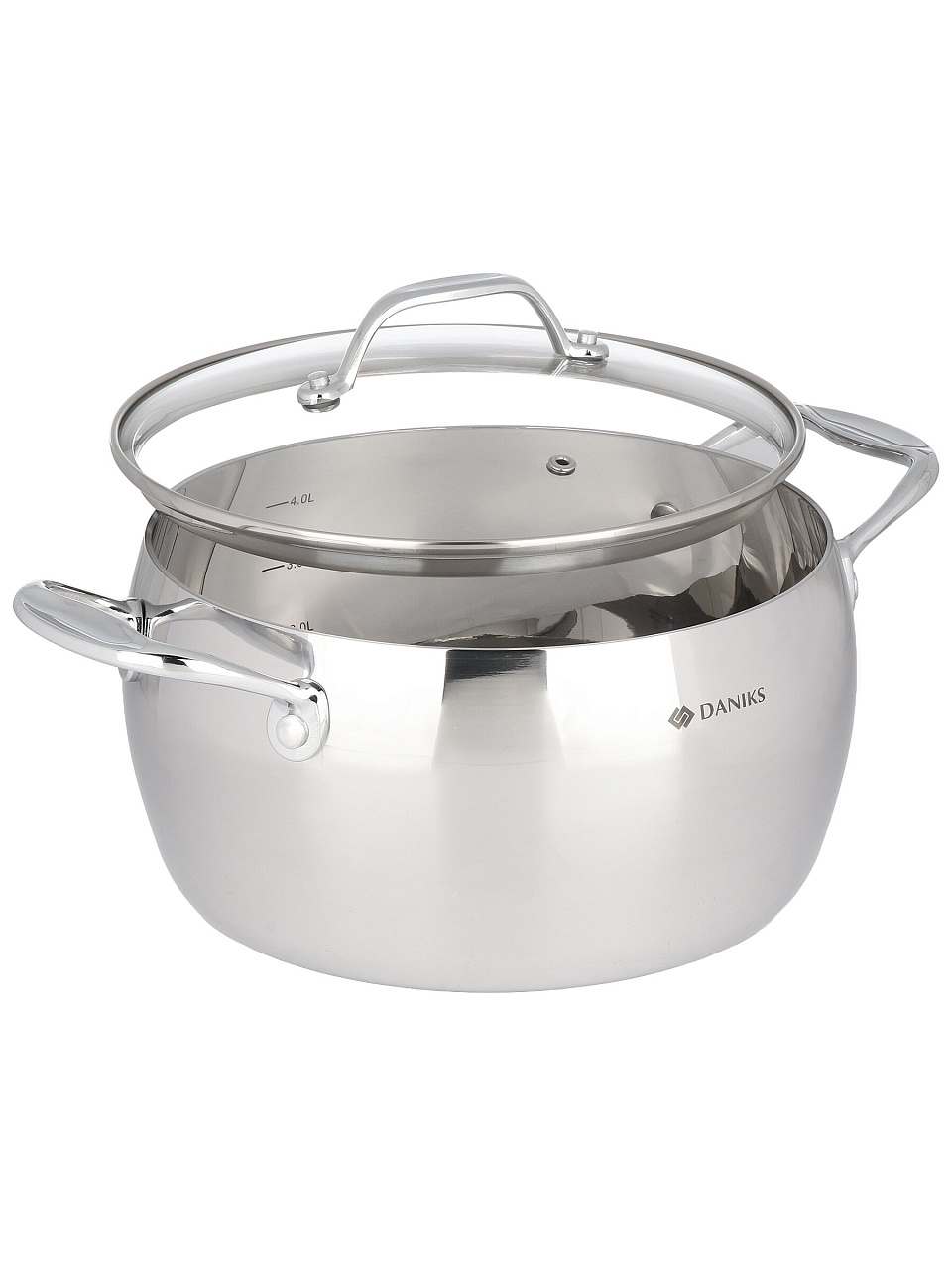 Кастрюля из нержавеющей стали 4.7 л Daniks Manola — оптимальный выбор для индукции и любых плит, с мерной шкалой и стеклянной крышкой для идеальных домашних блюд.