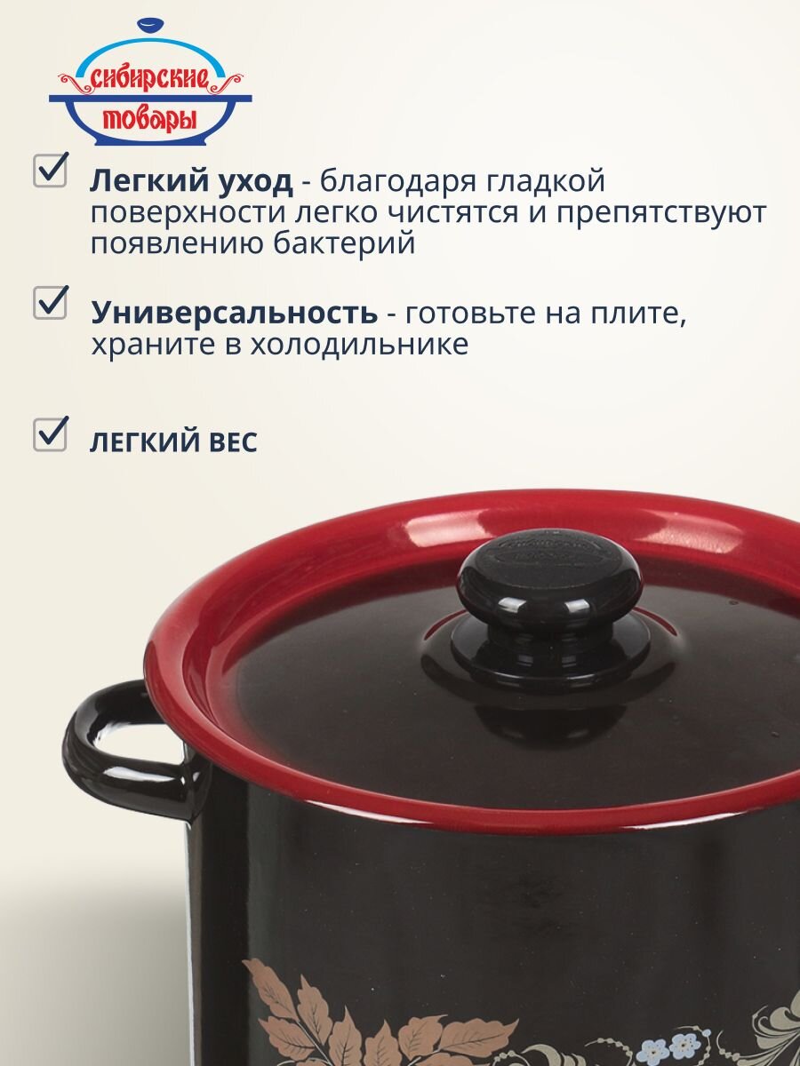 Эмалированная кастрюля объёмом 5,5 литра от бренда «Сибирские товары» — это оптимальный выбор для тех, кто ищет недорогую, но надёжную посуду для кухни или дачи. Эмалированная сталь не впитывает запахи, устойчива к коррозии и легко моется даже в посудомоечной машине. Если вы ищете, какую кастрюлю выбрать для варки супов, компотов или заготовок — эта модель отлично подойдёт для ежедневного и сезонного использования.
