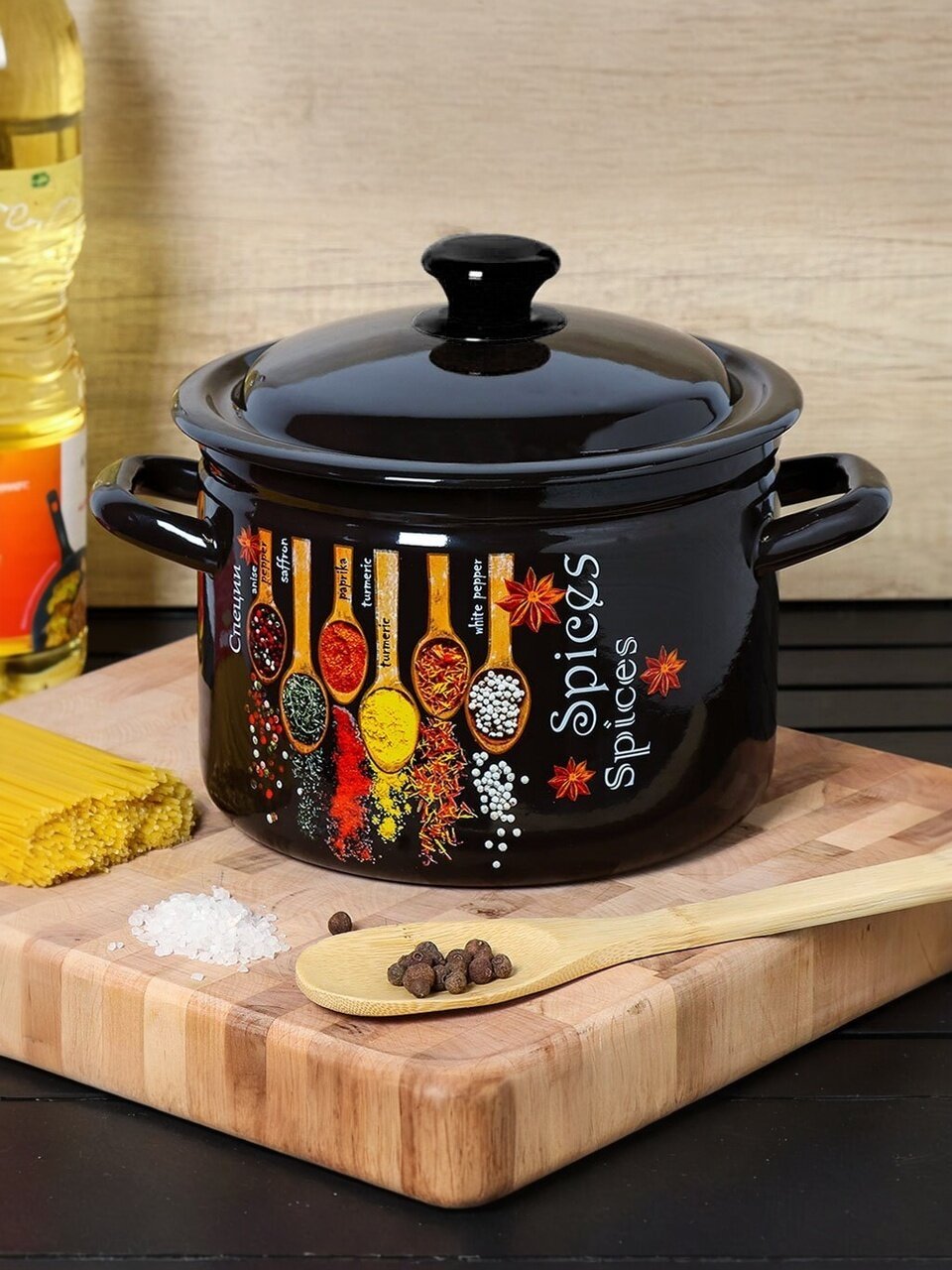 - Уникальное сочетание прочной эмалированной стали и стильного декора — кастрюля не только функциональна, но и украшает кухню.