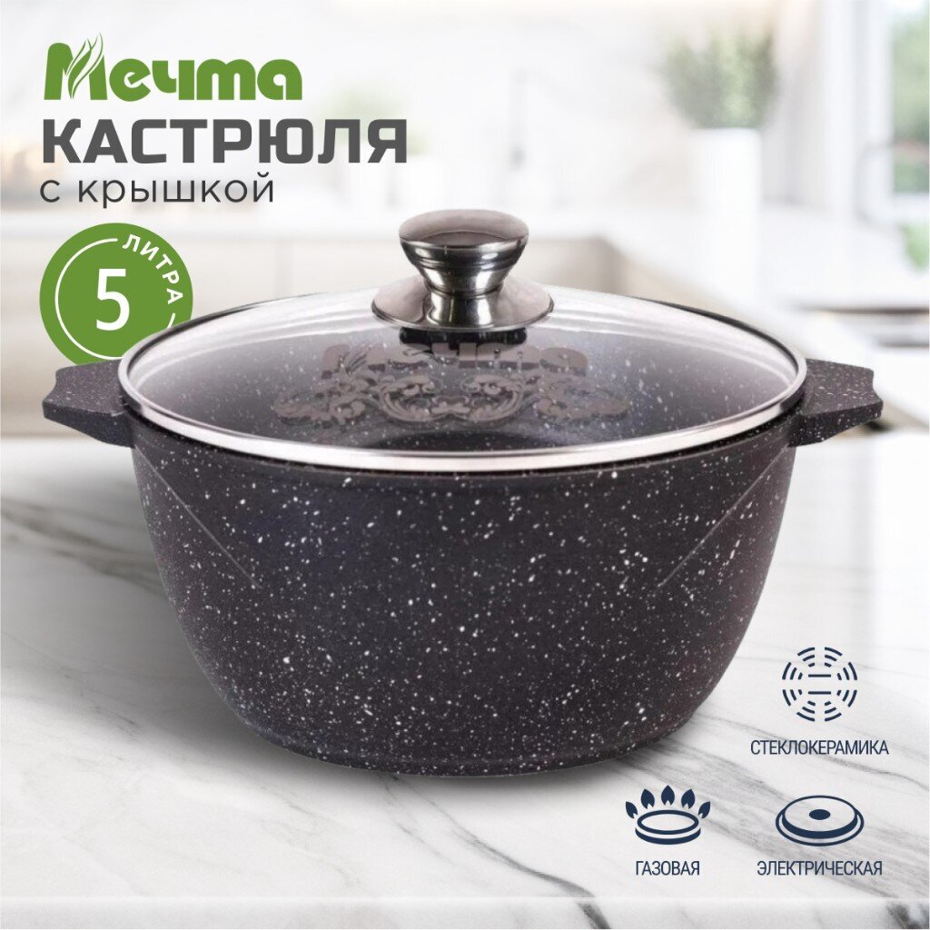 Кастрюля алюминиевая с антипригарным гранитным покрытием 5 л «Мечта Гранит black» — выбор для семьи: быстрое приготовление, стеклянная крышка, подходит для любых блюд.