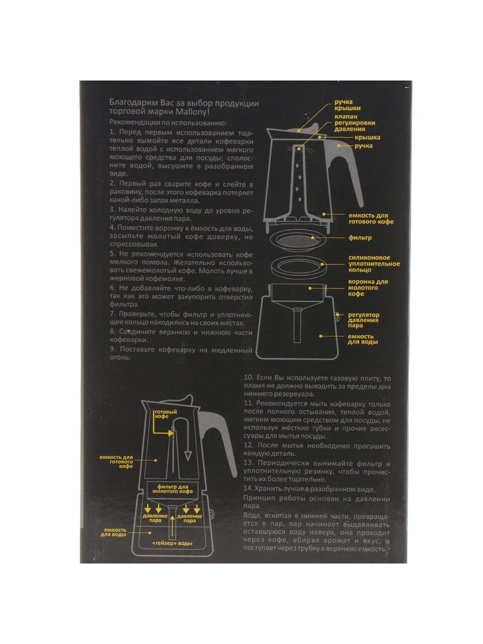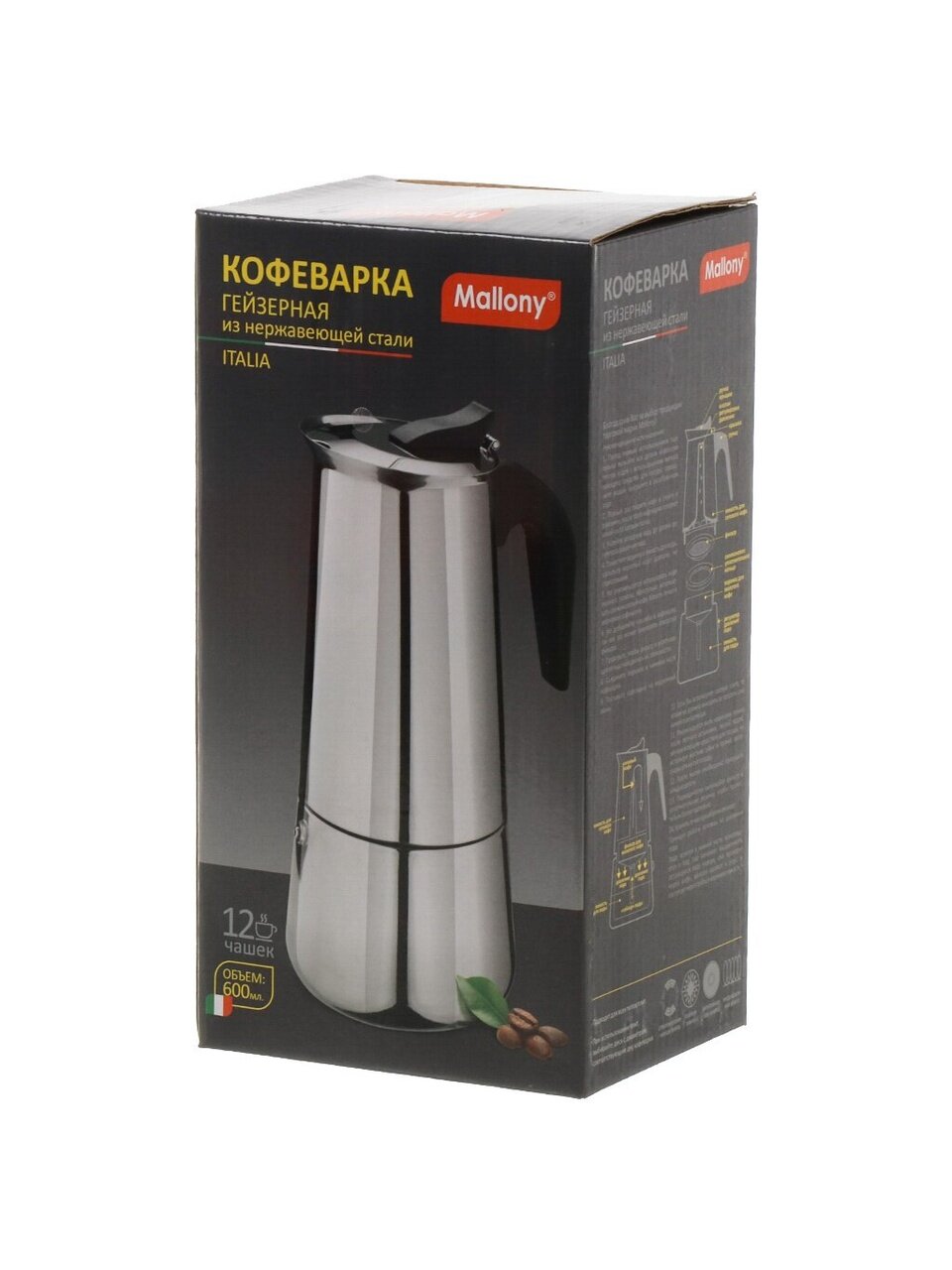 Любители насыщенного и ароматного кофе по достоинству оценят гейзерную кофеварку Mallony. Она способна приготовить сразу 12 порций кофе за 1 раз. Модель Italia предназначена для приготовления кофе на плите.