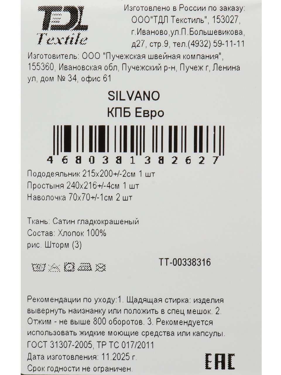 Постельное белье евро Silvano "Шторм" из сатина: премиальный хлопок, идеальные размеры для комфортного сна, стильный подарок в подарочной упаковке.