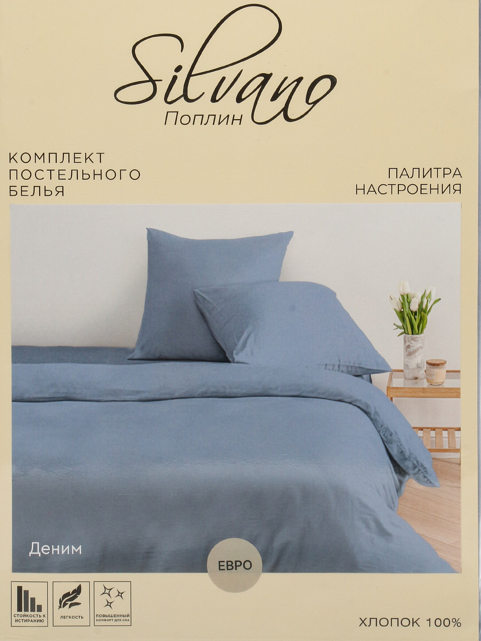 Постельное белье Silvano евро из поплина «Деним»: прочный хлопок, 4 наволочки, универсальный голубой цвет — для комфортного сна дома и стильного подарка.