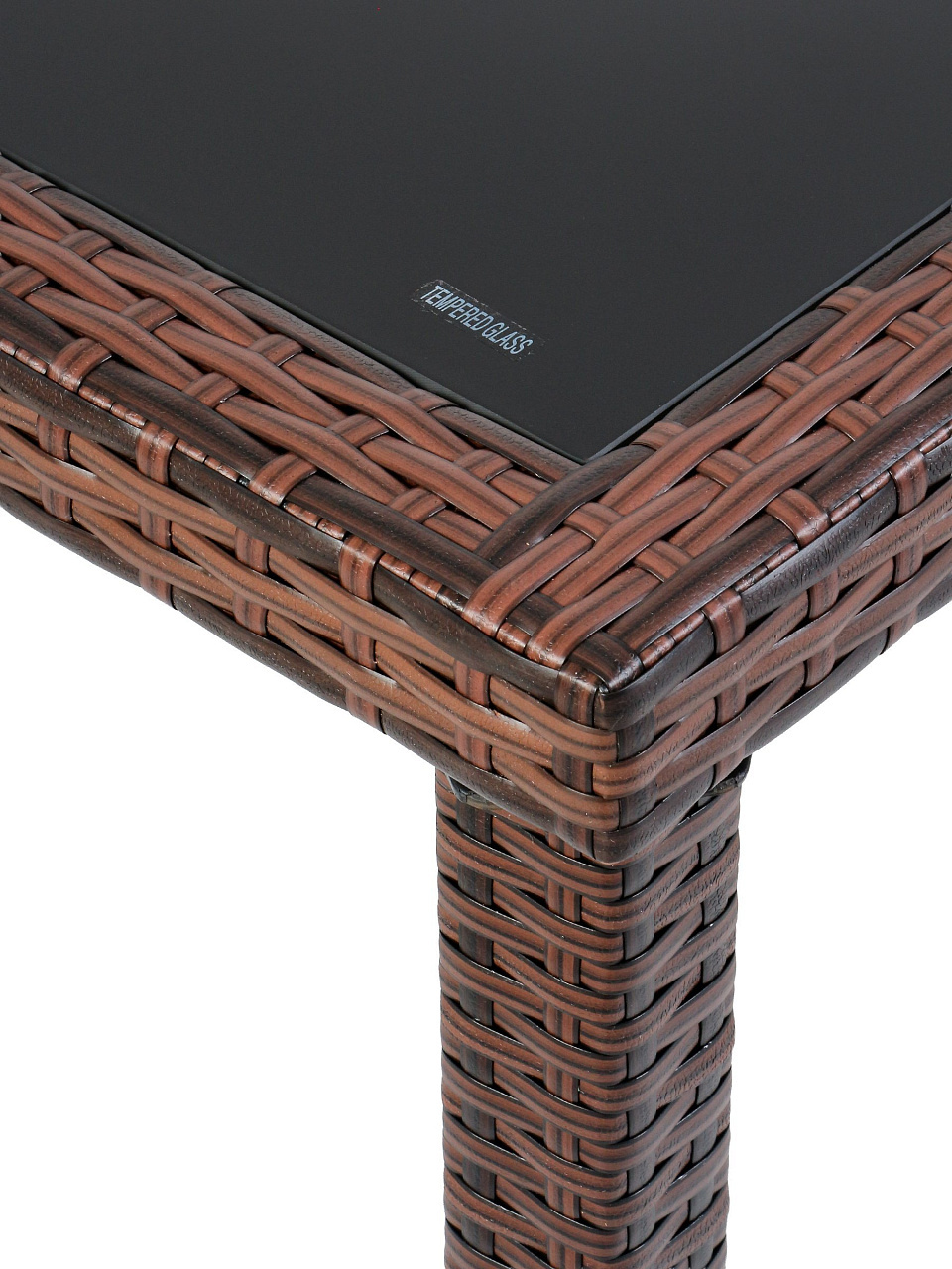 - Долговечность материалов: столешница из закаленного стекла с глянцевым покрытием устойчива к царапинам и проста в уходе, что важно для уличной мебели.
