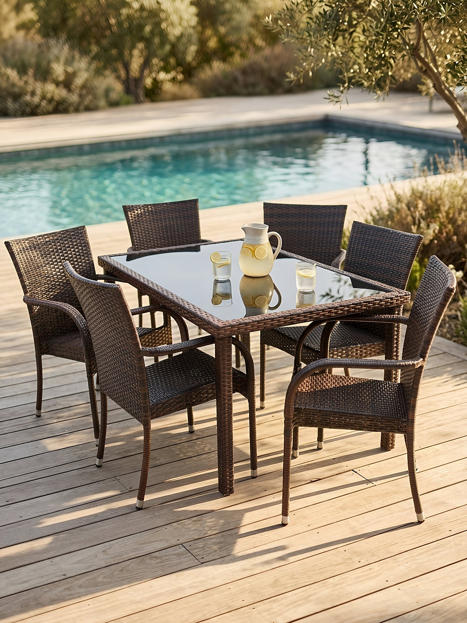 Для комфортного размещения шести человек важно учитывать габариты обеденной зоны. Данный набор включает 6 стульев и прямоугольный стол, что позволяет удобно расположить гостей, сохраняя достаточно свободного пространства на террасе или в саду.