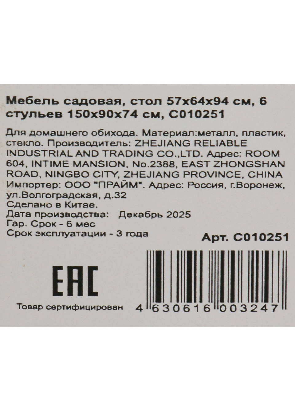 Создайте уютное пространство для встреч с близкими уже сегодня. Оформите заказ на комплект садовой мебели C010251 сейчас и получите гарантию от производителя на 6 месяцев, подтверждающую уверенность в качестве каждой детали.