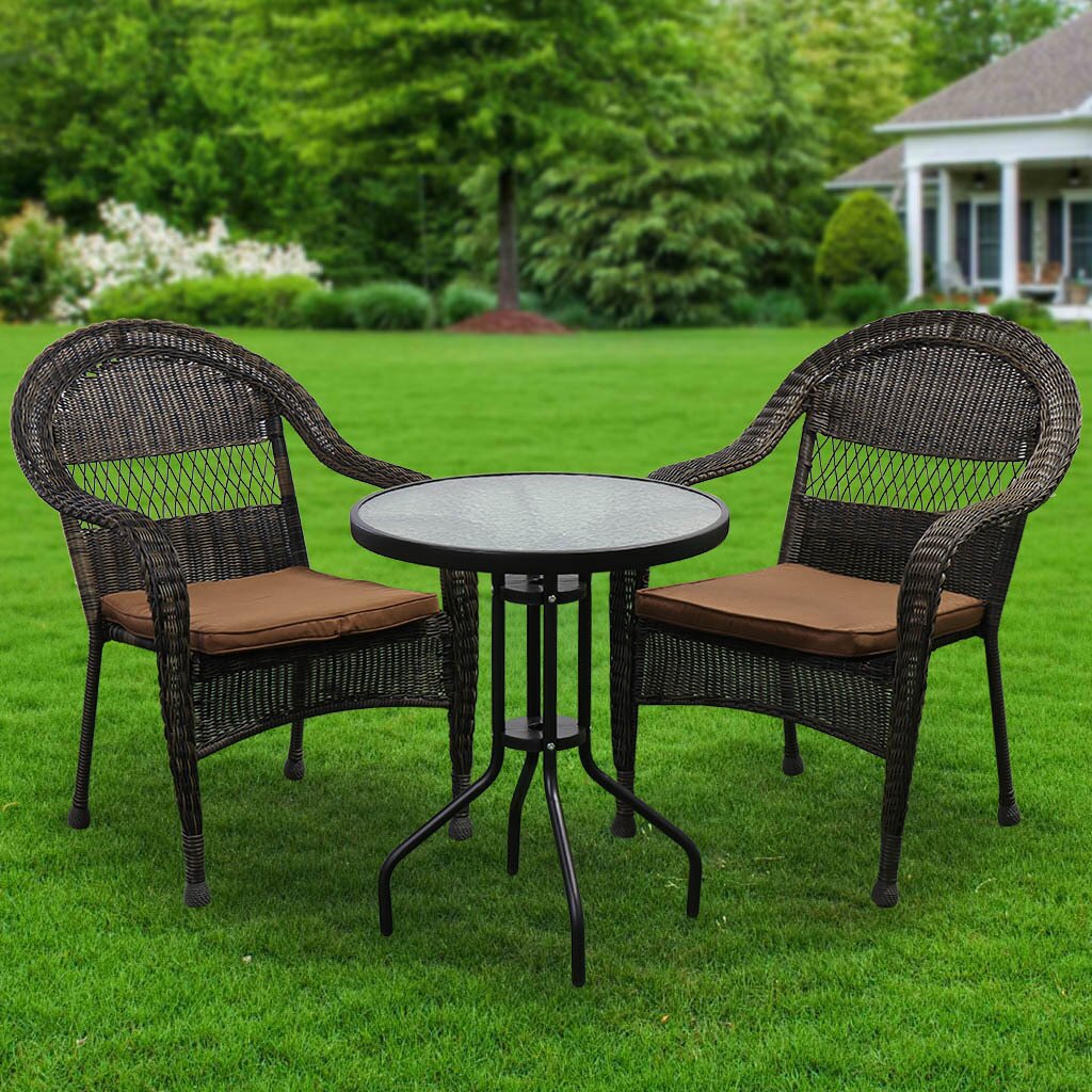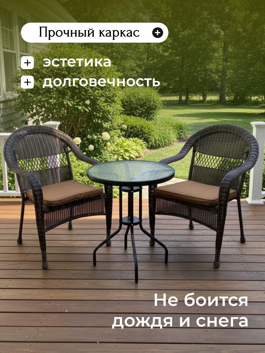 Роскошный комплект плетеной мебели станет отличным дополнением для загородного дома или дачи. Комплект состоит из двух стульев и стола со столешницей из стекла. Выполнен из искусственного ротанга, устойчивого к физическому и климатическому воздействию. Отлично подходит для летней веранды на даче.