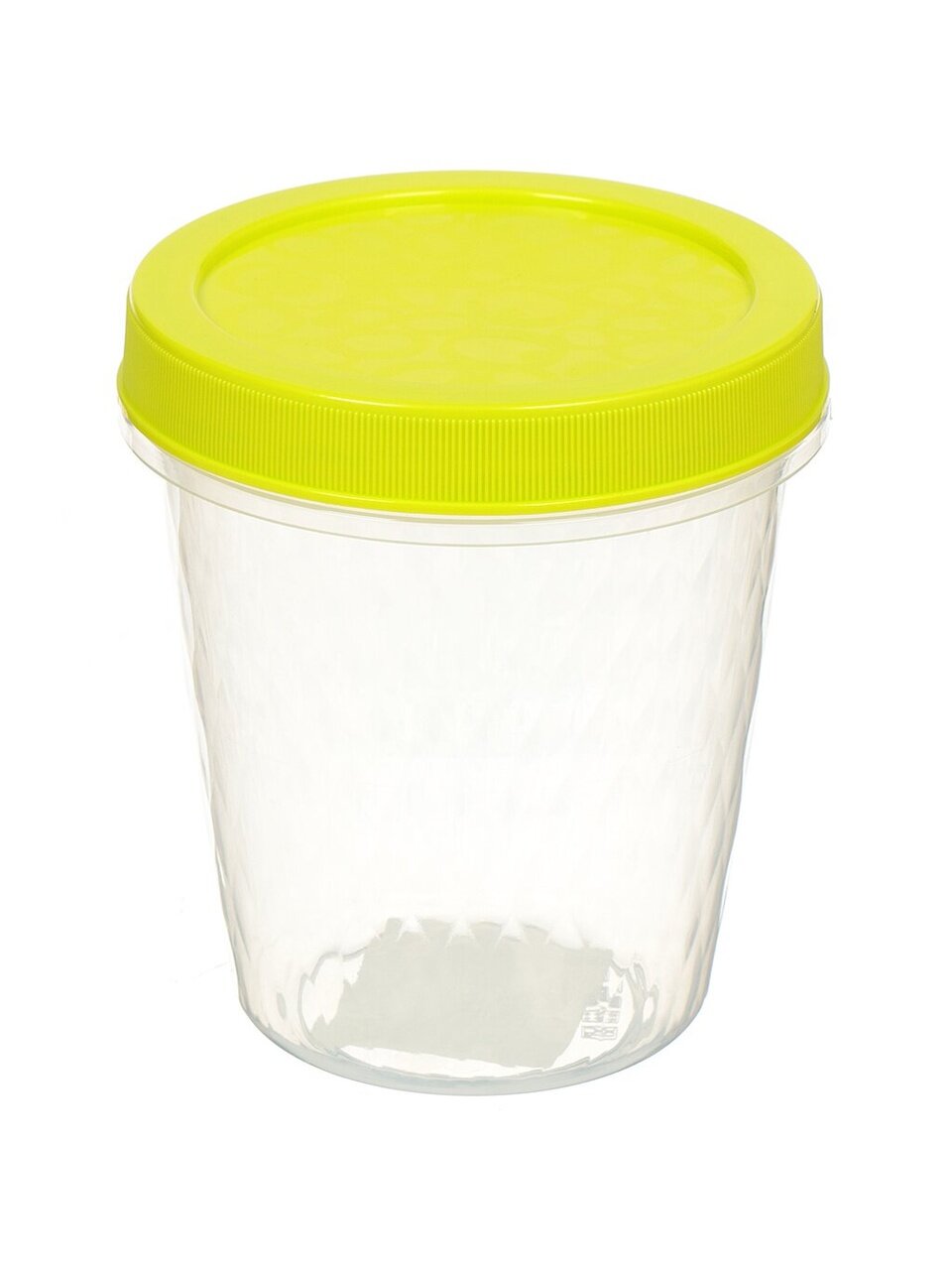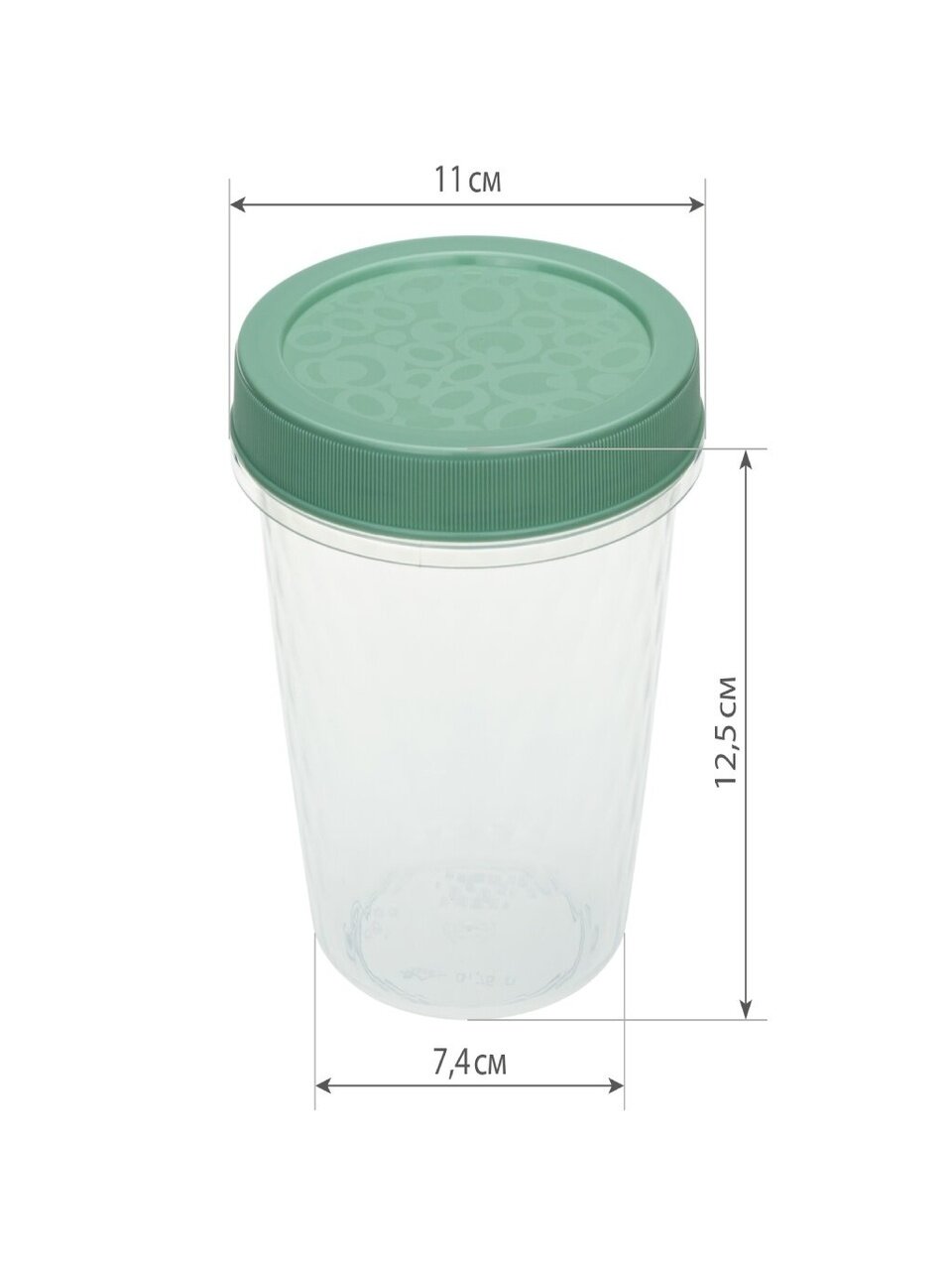 Объем составляет 0,75 литра (округленно — 0,8 л), размеры: 11×11×12,5 см, форма — круглая, модель — Ролл, материал — пищевой пластик.