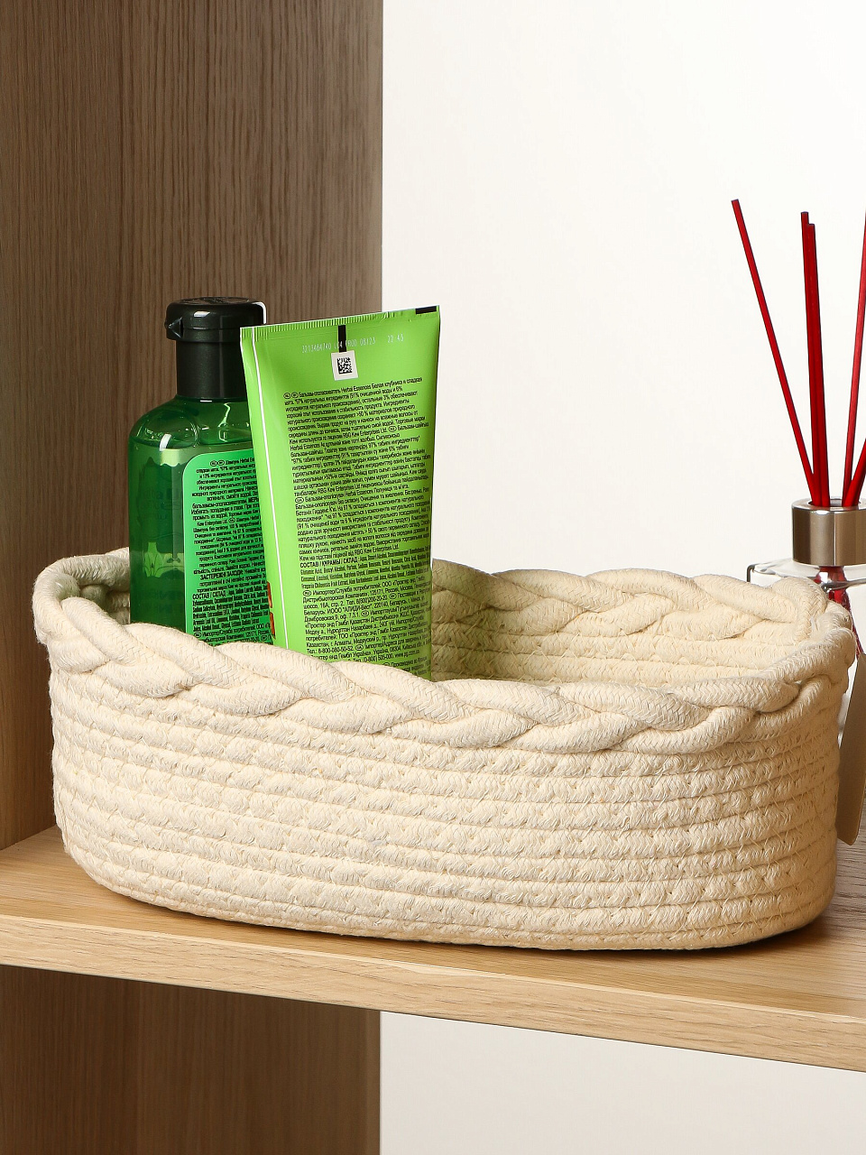 Корзина выполнена из натуральных материалов с прочным плетением. Для ухода достаточно протереть влажной тканью и избегать длительного контакта с влагой.