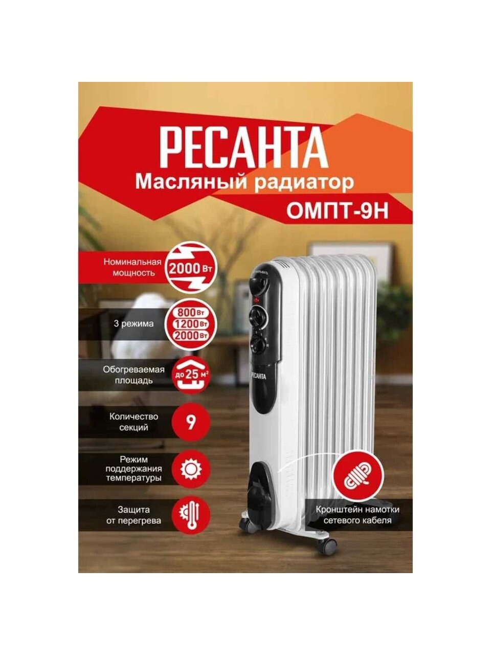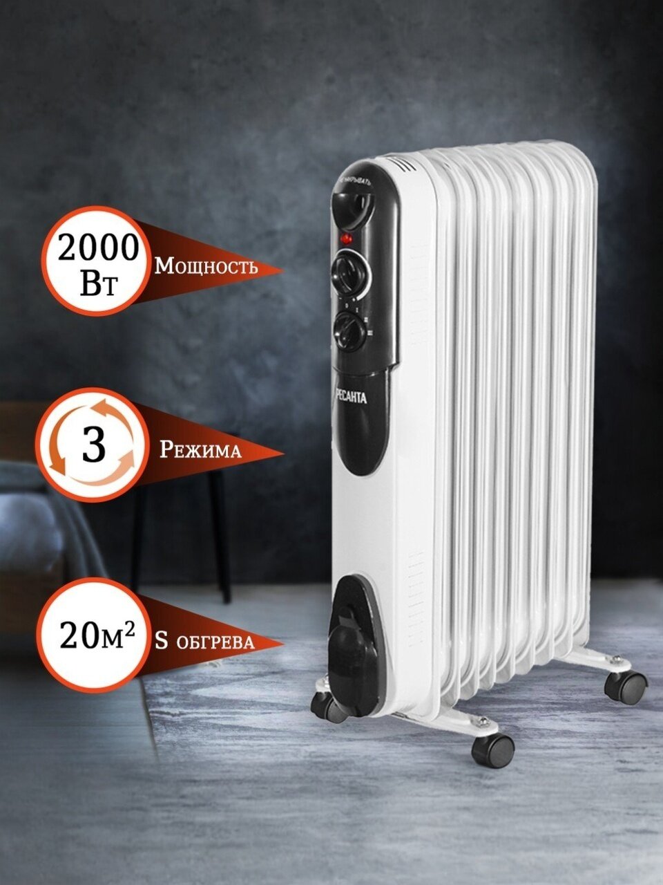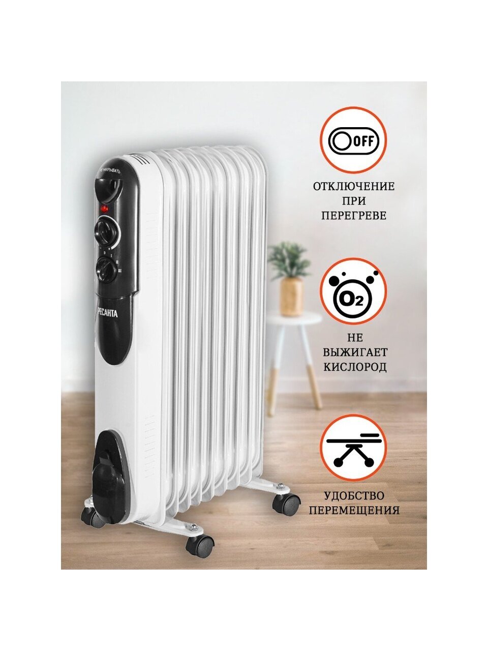Масляный радиатор Ресанта предназначен для обогрева воздуха и создания комфортной атмосферы в холодное время года. В металлическом корпусе находится масло, нагреваемое до высокой температуры при помощи нагревательного элемента. Далее радиатор отдает тепло помещению. Масляный радиатор оснащен термостатом, что позволяет ему автоматически поддерживать в помещении заданную пользователем температуру.