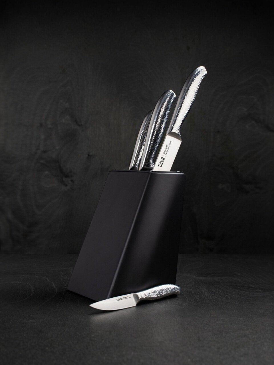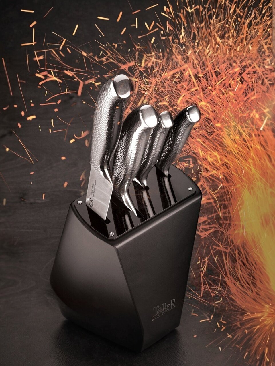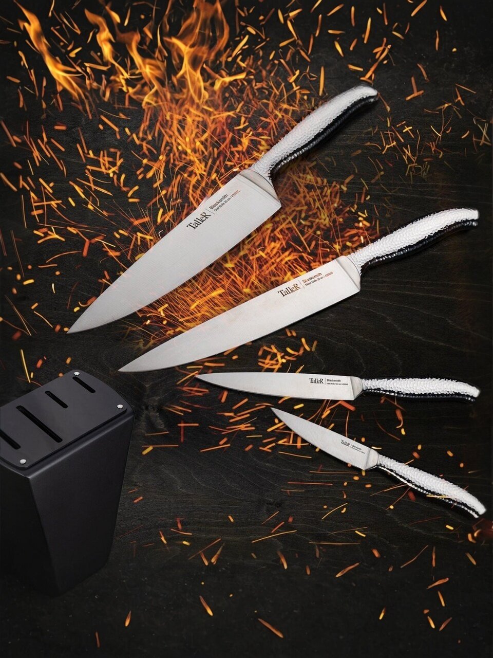 Набор ножей Taller Блэксмит 22087 создан для тех, кто ценит профессиональный подход к приготовлению блюд и желает подчеркнуть статус своей кухни. Качественная нержавеющая сталь сохраняет остроту лезвий даже при интенсивном использовании, а эргономичные рукоятки обеспечивают максимальный комфорт и безопасность при нарезке. Деревянная подставка не только украшает рабочее пространство, но и защищает ножи от повреждений, продлевая срок службы каждого предмета.