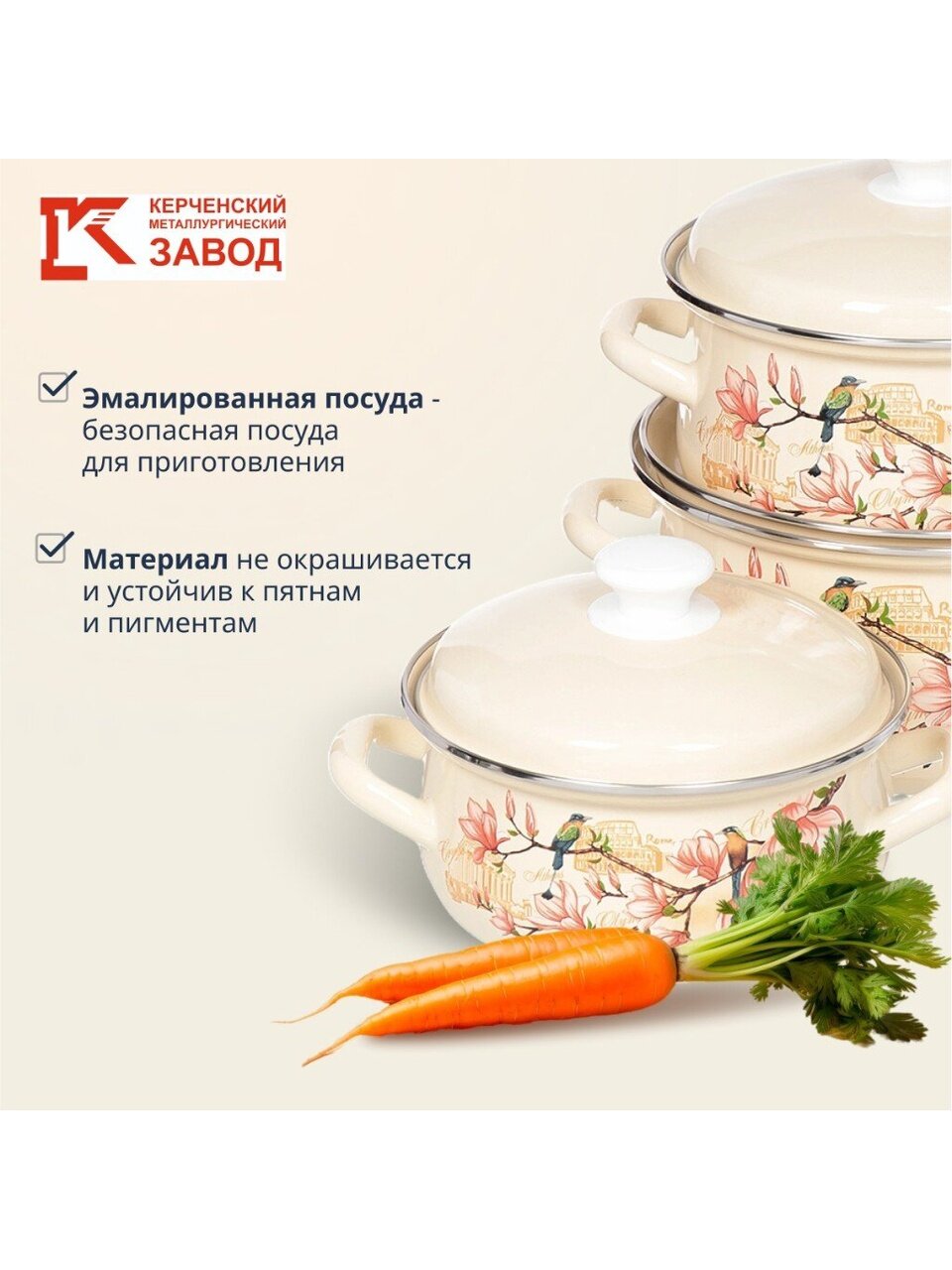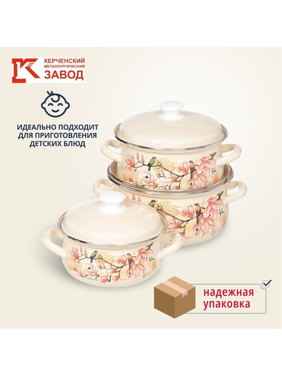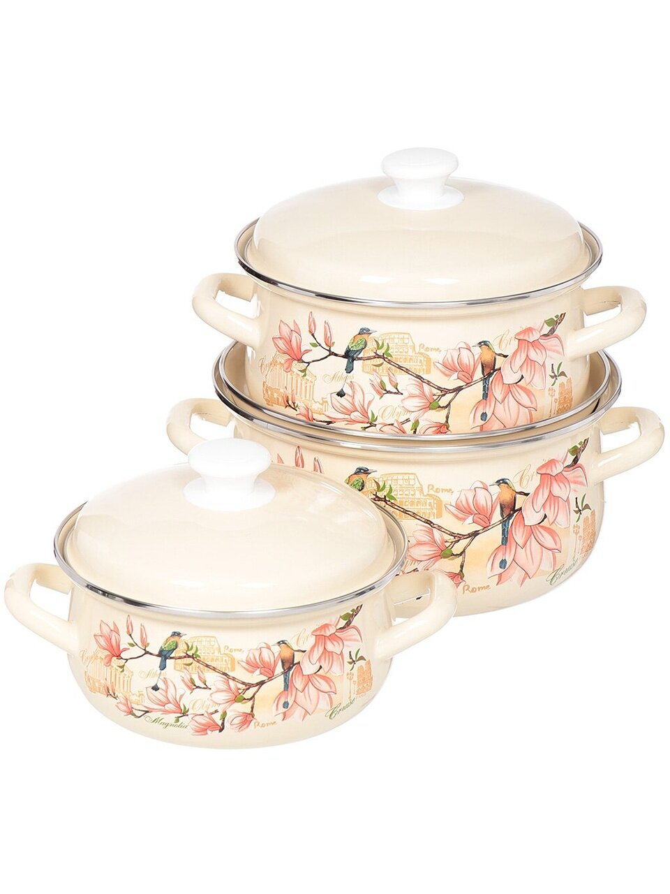В комплекте три кастрюли объёмом 2, 3 и 4 литра с крышками из стали. Цвет — бежевый, материал корпуса и крышек — эмалированная сталь, всего 6 предметов.