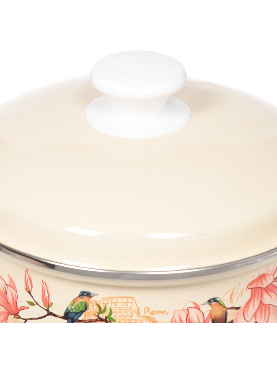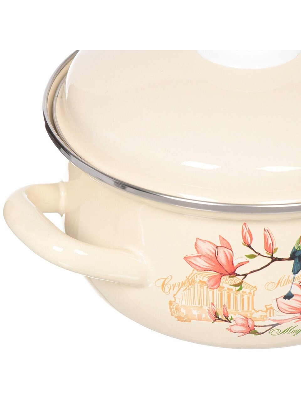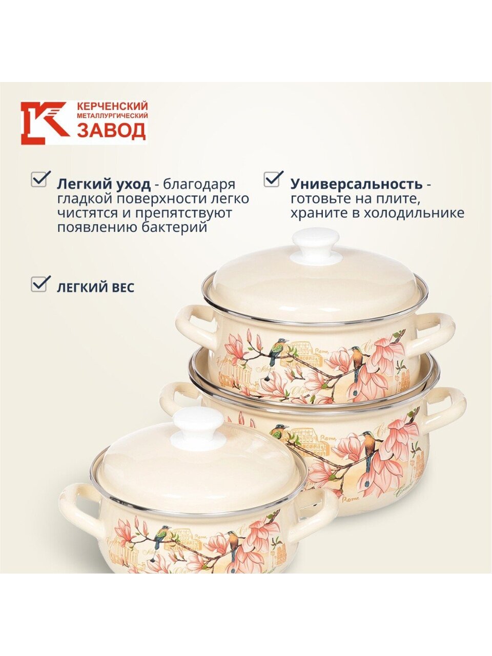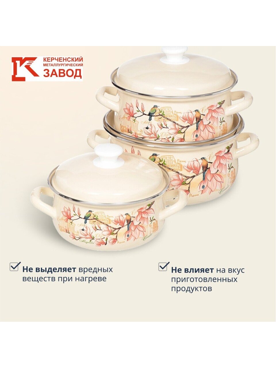 В комплекте три кастрюли объёмом 2, 3 и 4 литра с крышками из стали. Цвет — бежевый, материал корпуса и крышек — эмалированная сталь, всего 6 предметов.