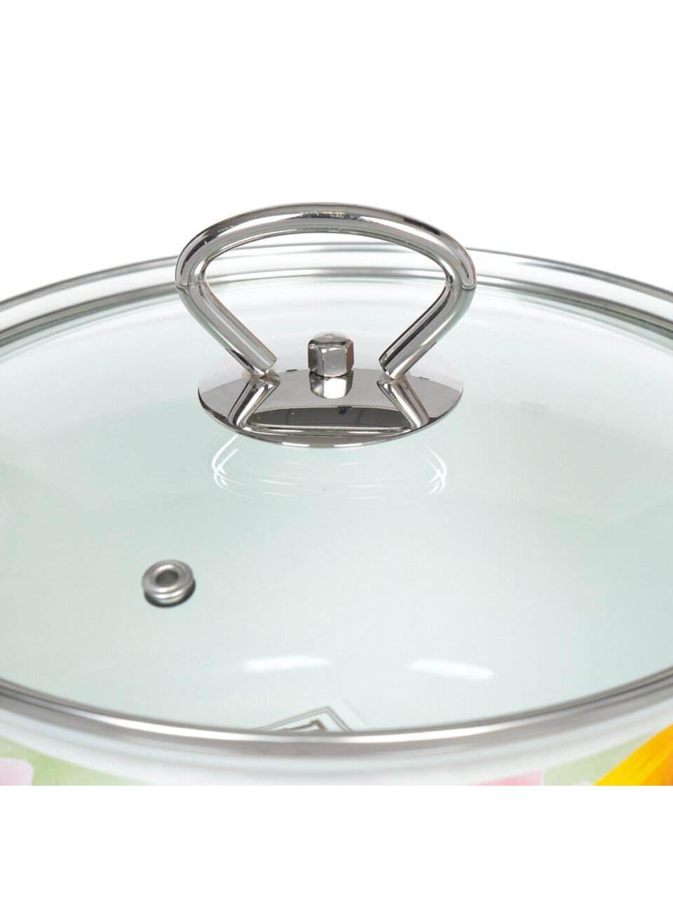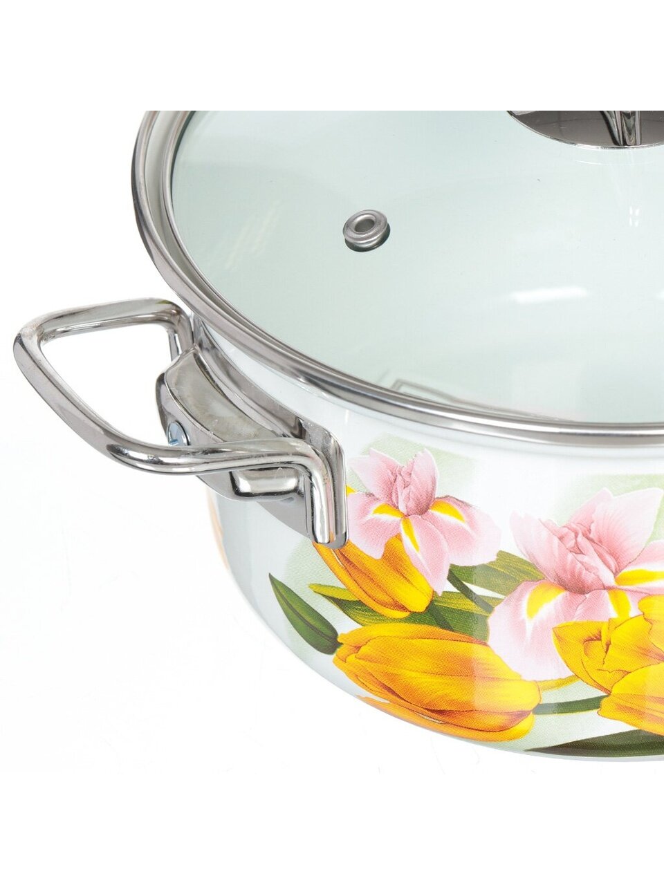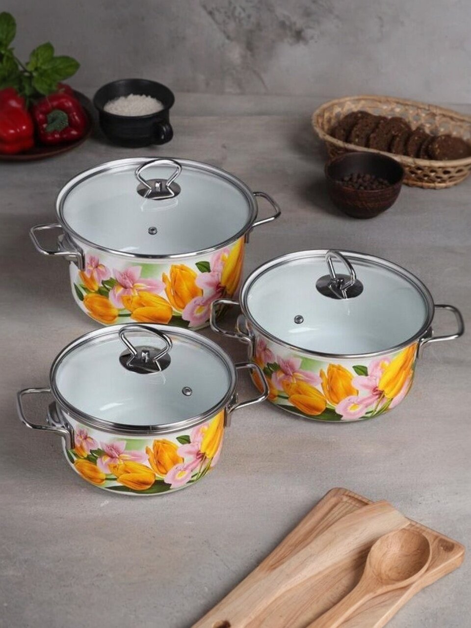 - Уникальное сочетание: эмалированная сталь + стеклянные крышки — долговечность, эстетика и удобство контроля приготовления