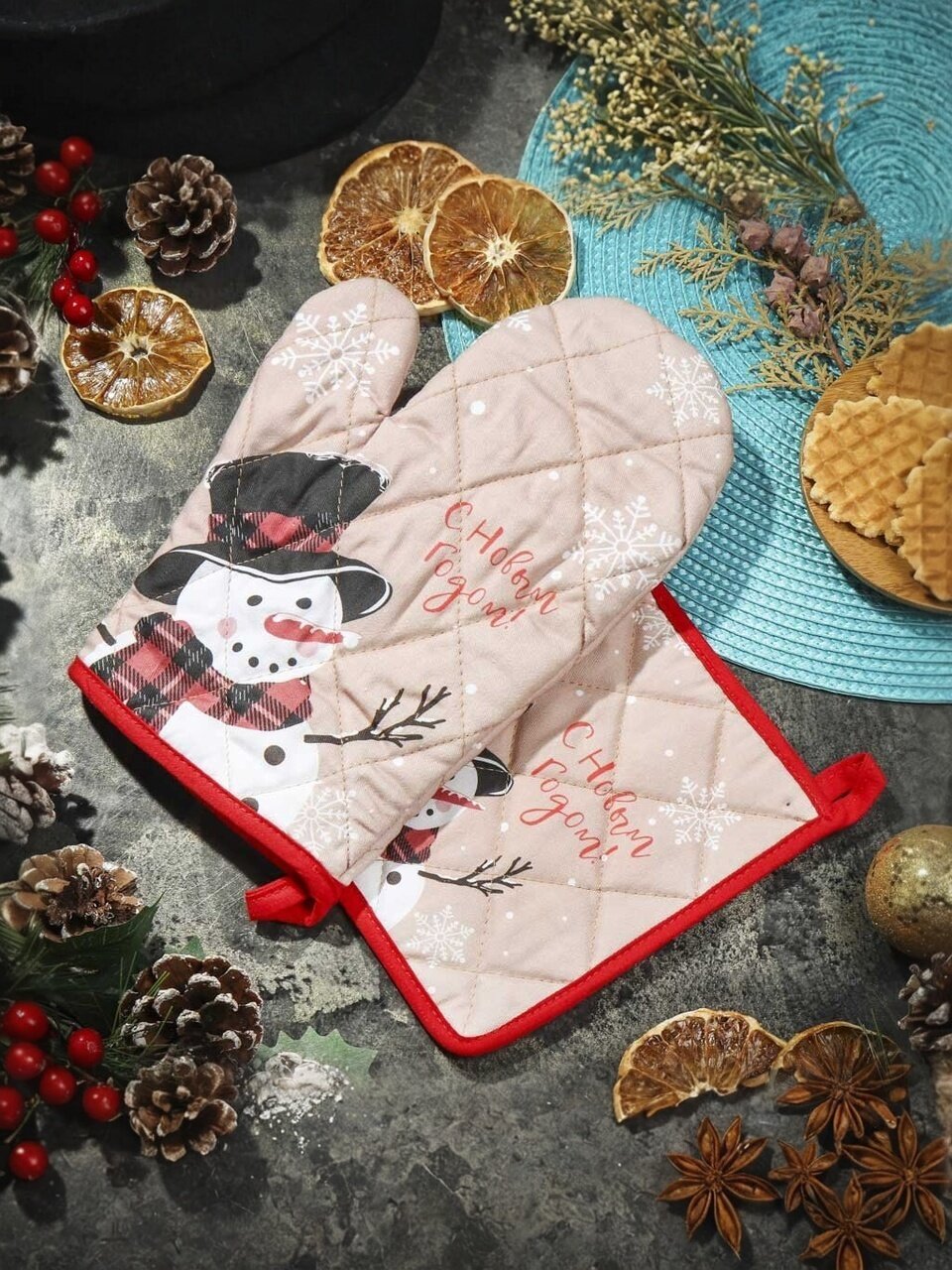 Нарядный кухонный набор - отличный подарок для хорошей хозяйки. В комплект входят прихватка и рукавица, которые защитят от ожогов, если нужно приготовить картошку-фри на кипящем масле, слить горячую воду из-под вареных овощей, достать раскаленные горшочки из духового шкафа. Для подвешивания на крючок есть петельки. Изделия, выполненные из практичного текстиля, стирают как вручную, так и в машине.