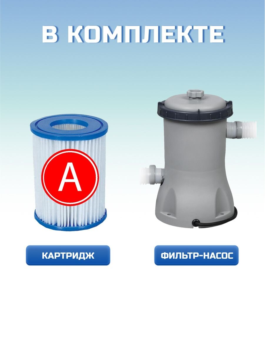 В комплекте идет фильтр-насос с производительностью 2006 л/ч, что позволяет поддерживать чистоту воды без лишних усилий. Картриджный фильтр типа A обеспечивает эффективную фильтрацию, а надувной борт добавляет комфорта и безопасности. Время установки бассейна составляет всего 10 минут, что позволяет быстро приступить к отдыху.