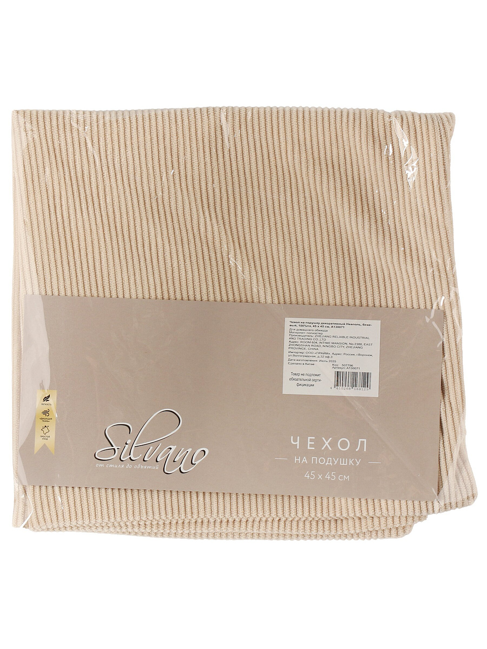 Размер наволочки — 45×45 см, подходит для большинства стандартных декоративных подушек. Молния позволяет быстро надевать и снимать чехол.