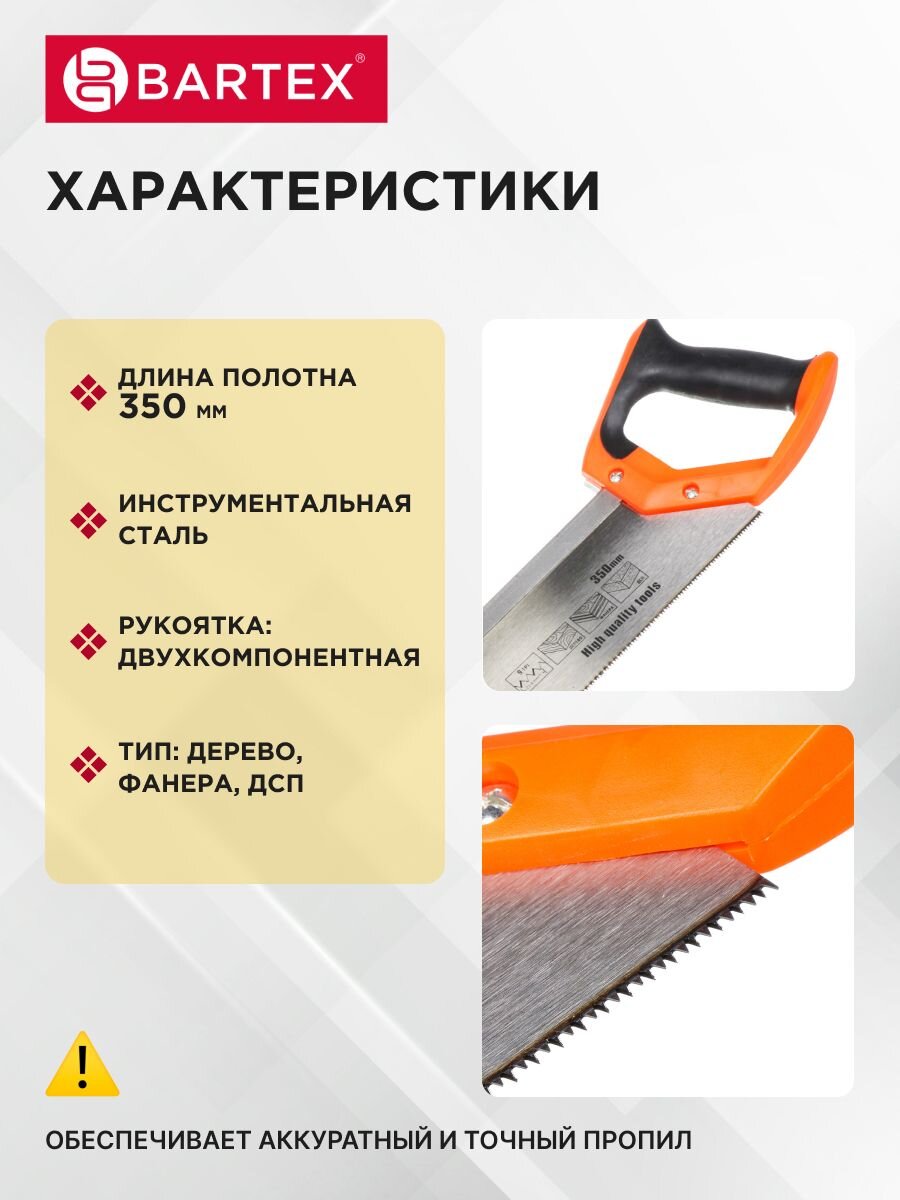 Ножовка Bartex предназначена для распила фанеры, различных видов древесины и ДСП. Данный инструмент отлично подходит для работы со стуслом. Ножовка состоит из широкого прямоугольного пильного полотна, утолщенного в верхней части, и рукоятки.