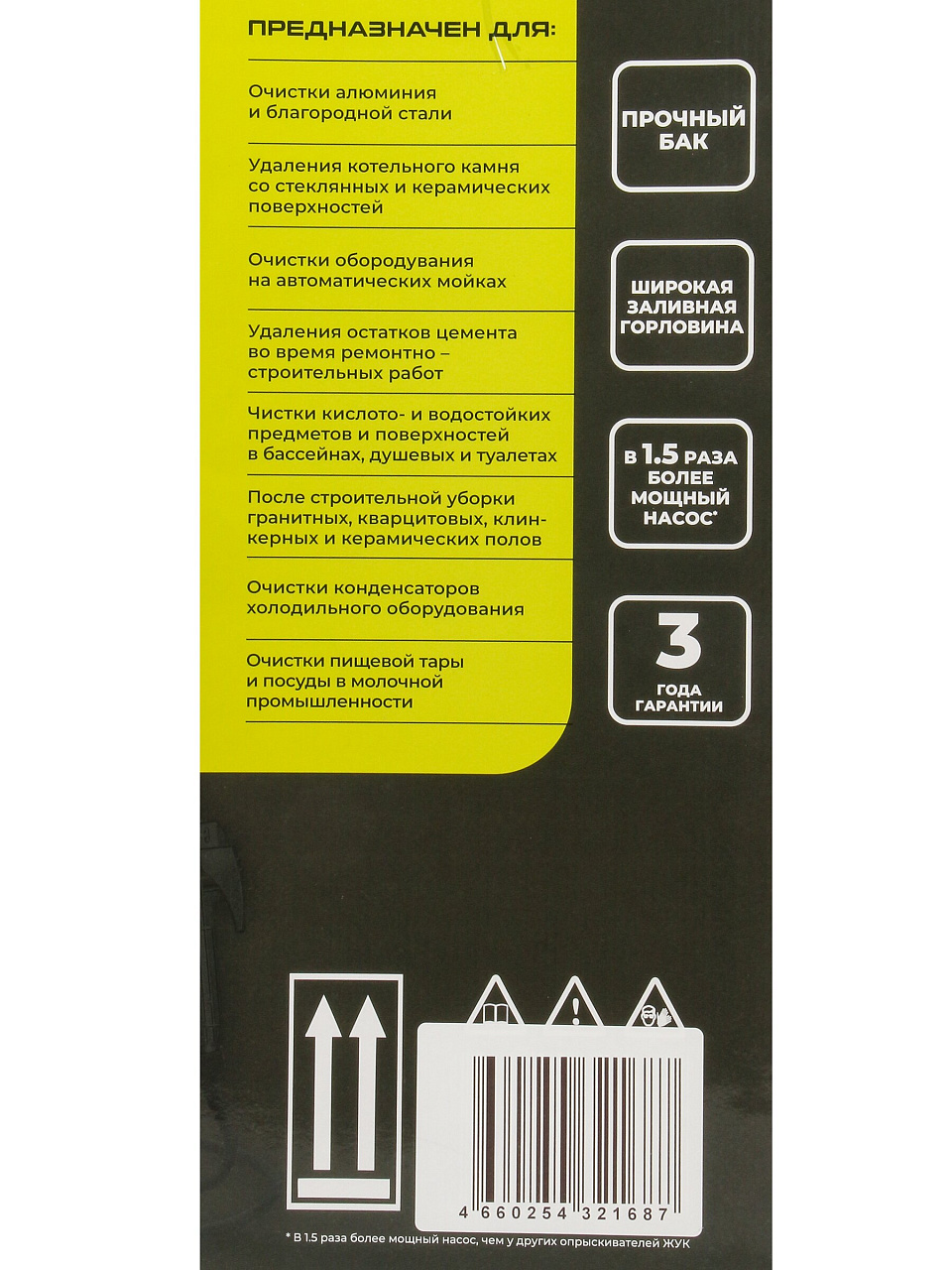 Объем бака — 9 литров, длина телескопической штанги — 970 мм, механизм — ручной помповый, цвет — зеленый, бренд — Жук, модель — Техно, артикул 321687-00.