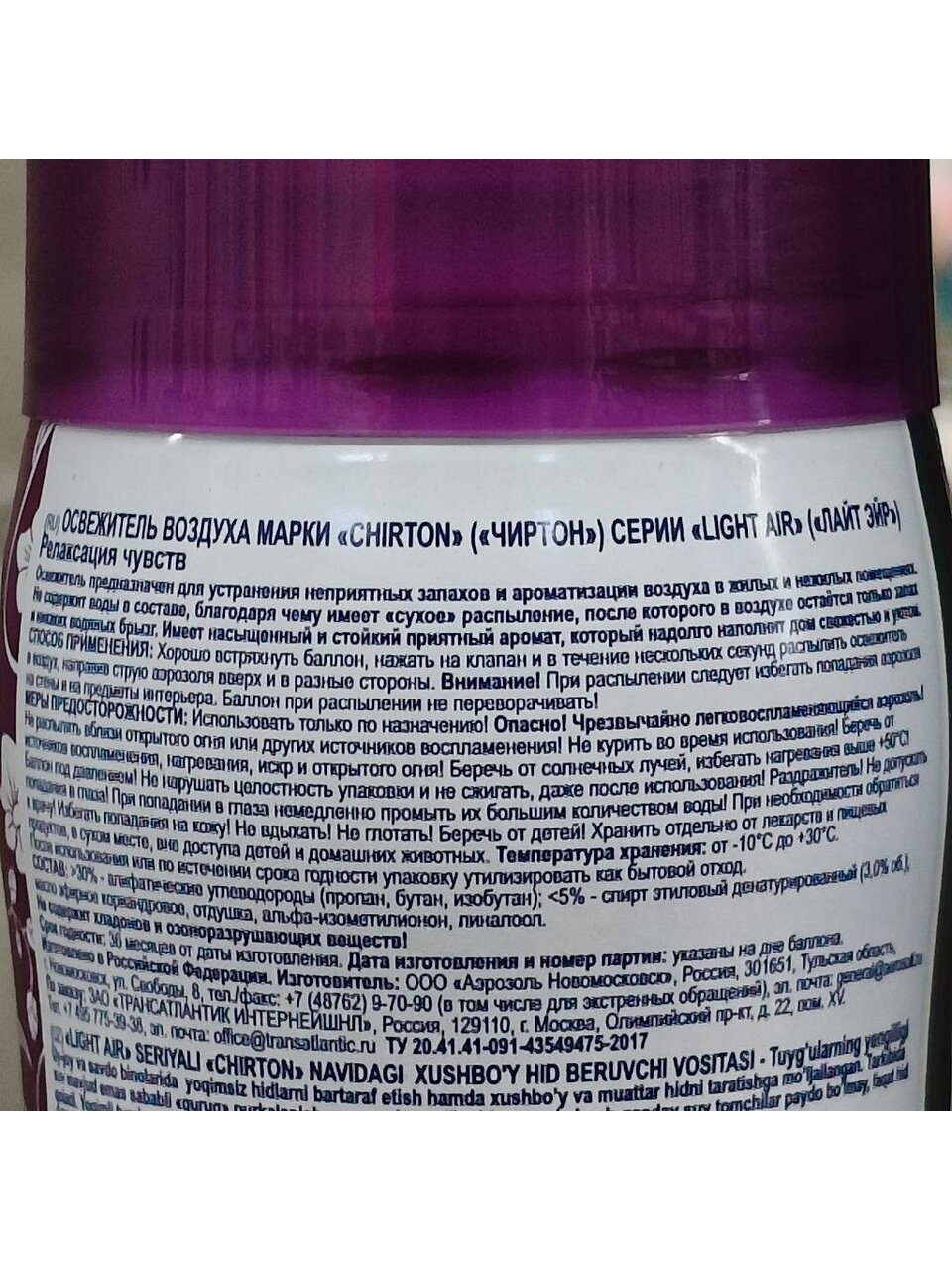 Освежитель предназначен для устранения неприятных запахов и ароматизации воздуха в жилых и нежилых помещениях. Не содержит воды в составе, благодаря чему имеет «сухое» распыление, после которого в воздухе остаётся только запах и никаких водяных брызг. Не оставляет следов при попадании на стены и предметы интерьера. Имеет насыщенный и стойкий приятный аромат, который надолго наполнит ваш дом свежестью и уютом.