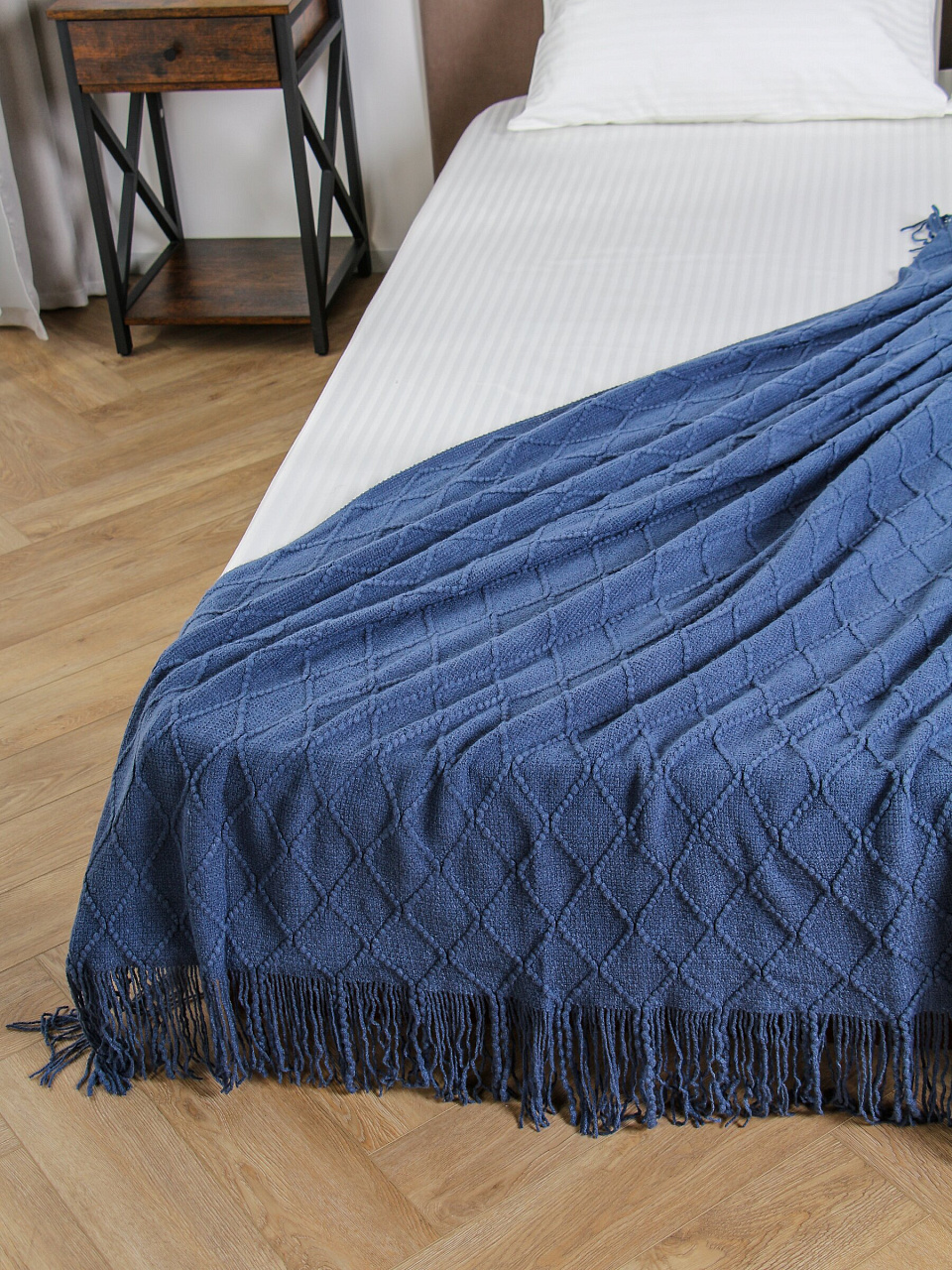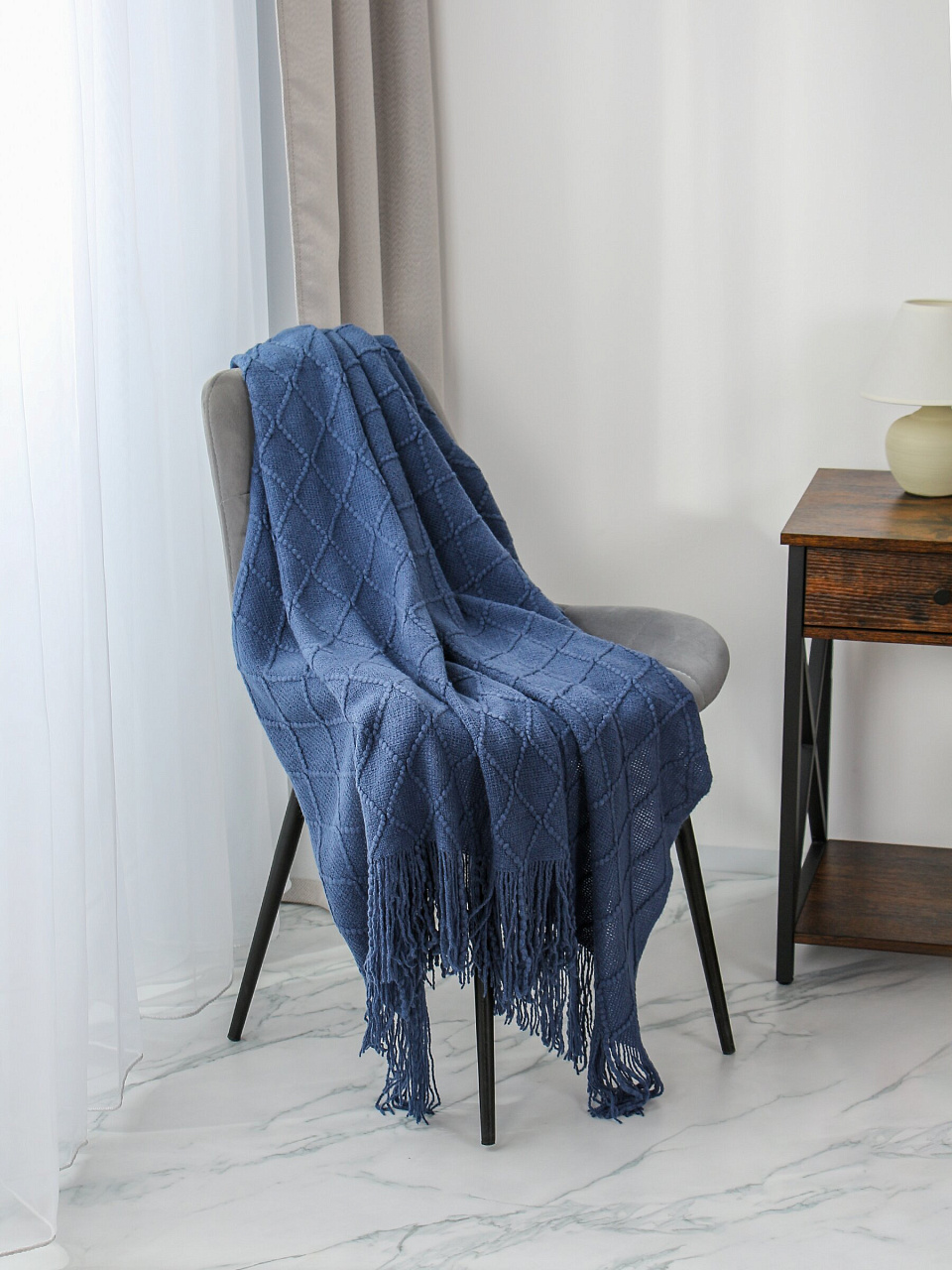 - Уникальное предложение: плотный вязаный плед с бахромой, сочетающий трендовый тёмно-синий цвет и универсальность для любого интерьера.