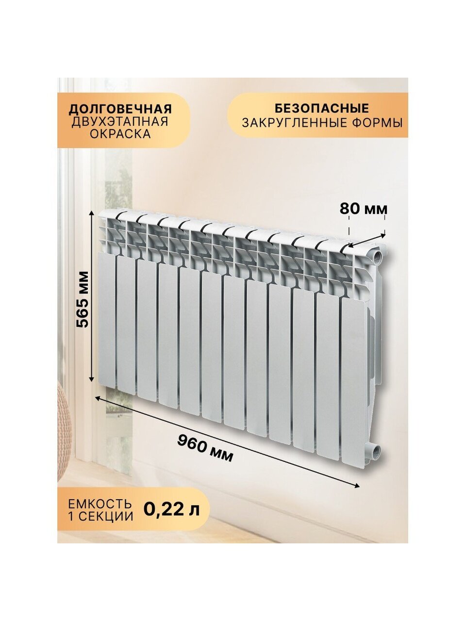 - Травмобезопасная конструкция — секции радиатора имеют закругленные формы без острых углов и кромок.