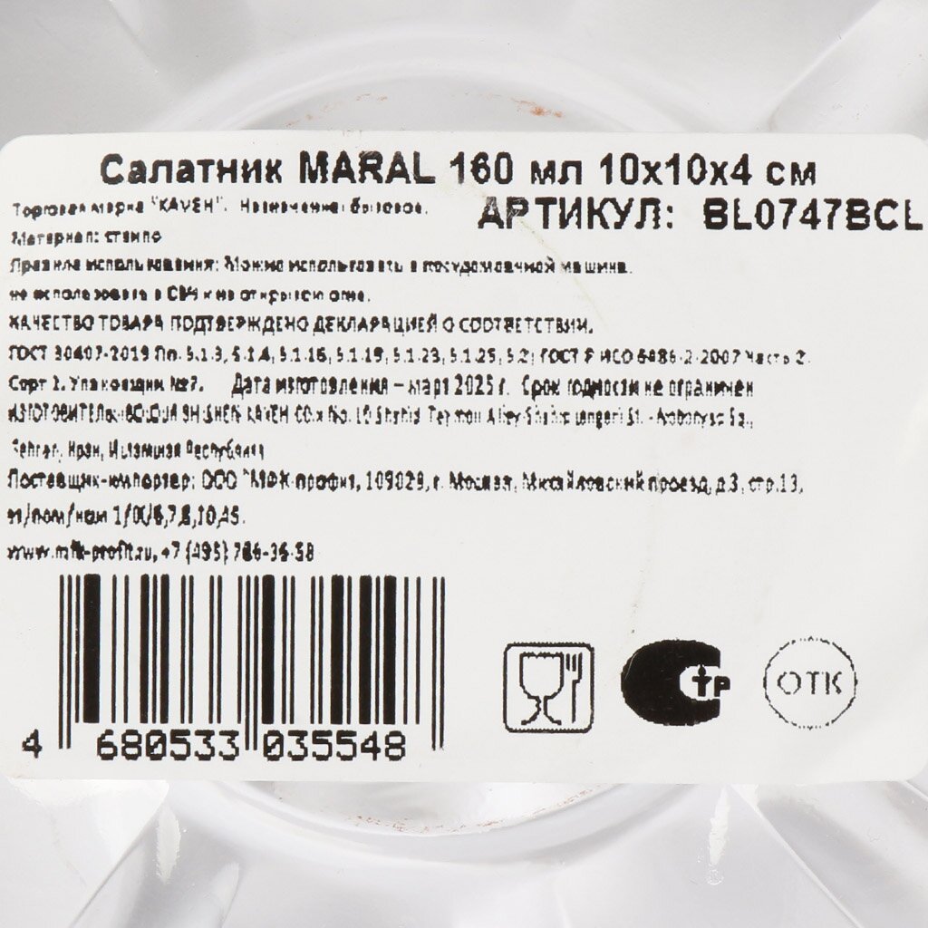 Объём — 0,16 л (округлённо 0,2 л). Такой салатник идеален для порционной подачи салатов, закусок, соусов, фруктов, орехов или детских блюд.
