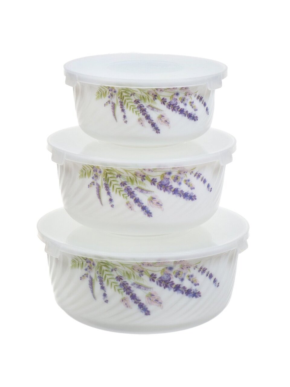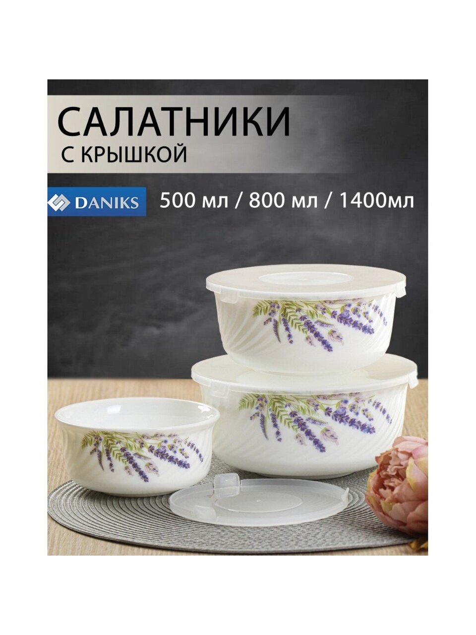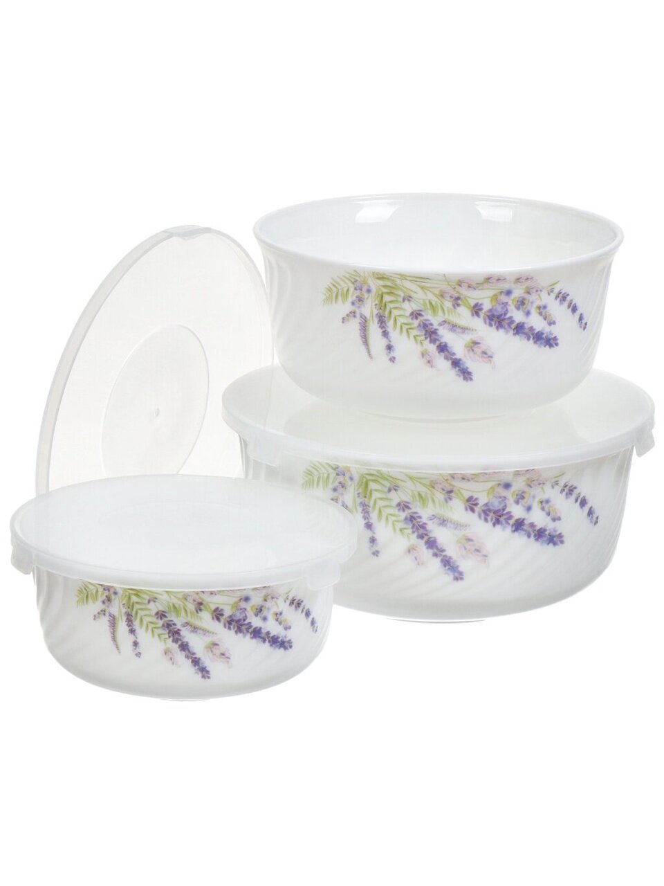 Салатники Daniks Лаванда: набор из 3 стеклокерамических мисок с крышками (0.5/0.8/1.4 л) для хранения, сервировки и подачи – стиль прованс для дома и дачи.