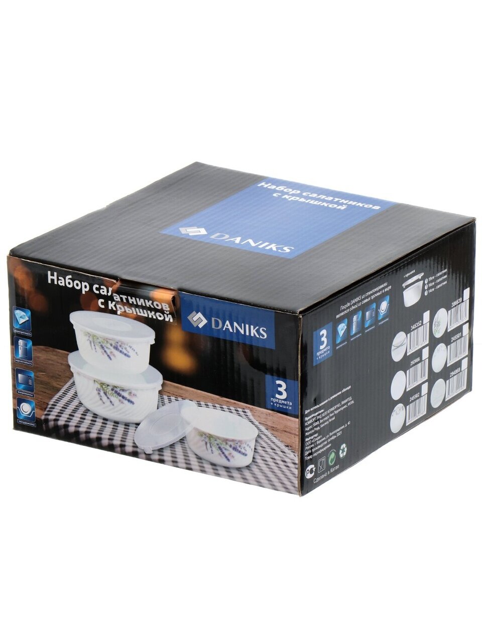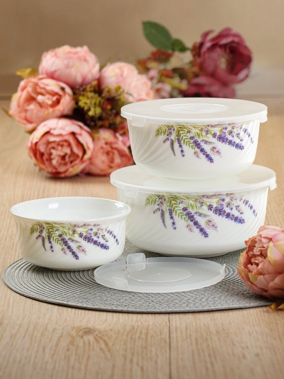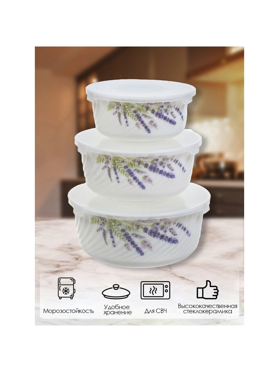 Салатники Daniks Лаванда: набор из 3 стеклокерамических мисок с крышками (0.5/0.8/1.4 л) для хранения, сервировки и подачи – стиль прованс для дома и дачи.