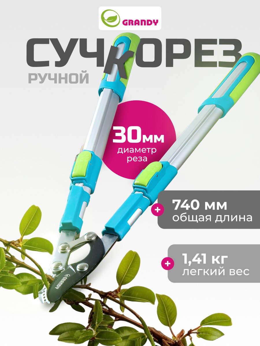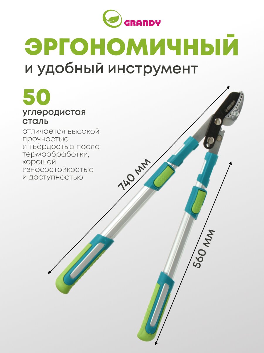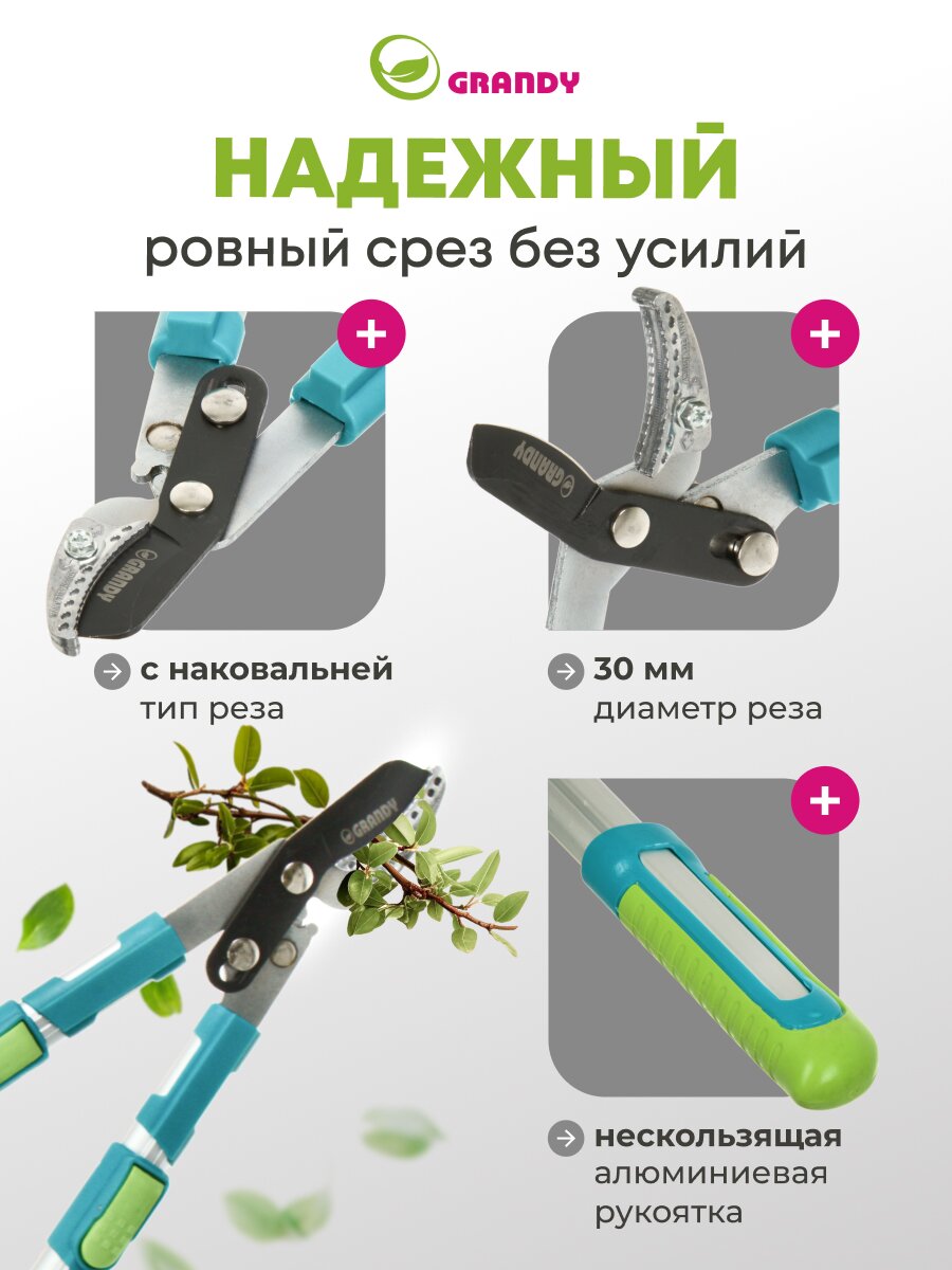 Сучкорез Grandy 740 мм с наковальней и телескопической алюминиевой рукояткой — легко обрезайте толстые ветки без усталости, экономьте время и силы при уходе за садом.