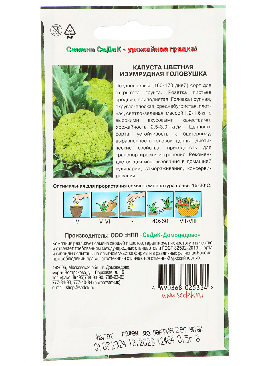 Семена цветной капусты "Изумрудная головушка" 0.5 г от Седек — позднеспелый сорт для стабильного урожая на даче и дома. Удобная цветная упаковка, выгодная цена.