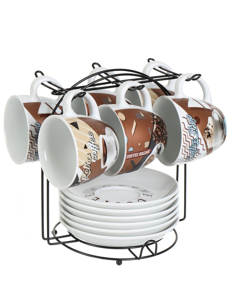 - Прочный фарфор, чашки по 180 мл, металлическая подставка — долговечность и компактное хранение