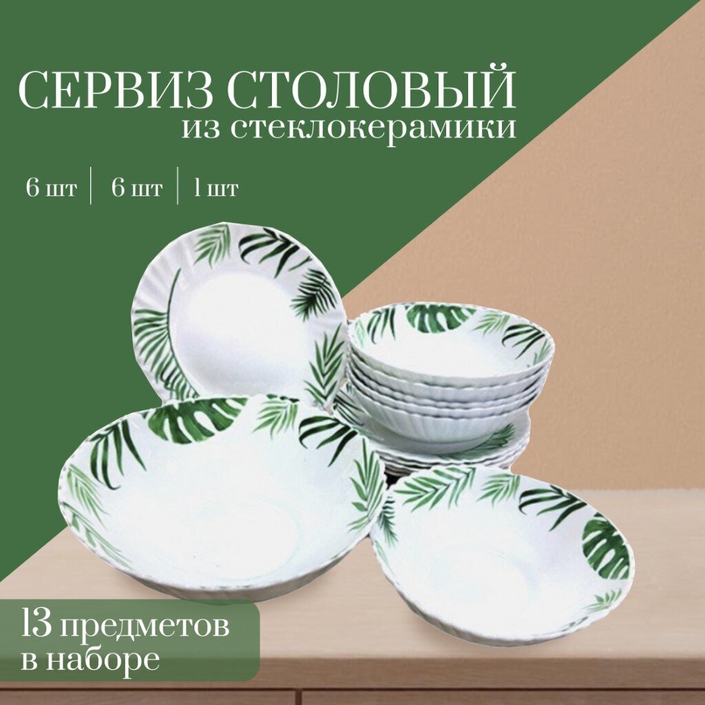 Столовый сервиз из стеклокерамики на 6 персон «Папоротник» (13 предметов): стильная сервировка без хлопот и риска лишних затрат.