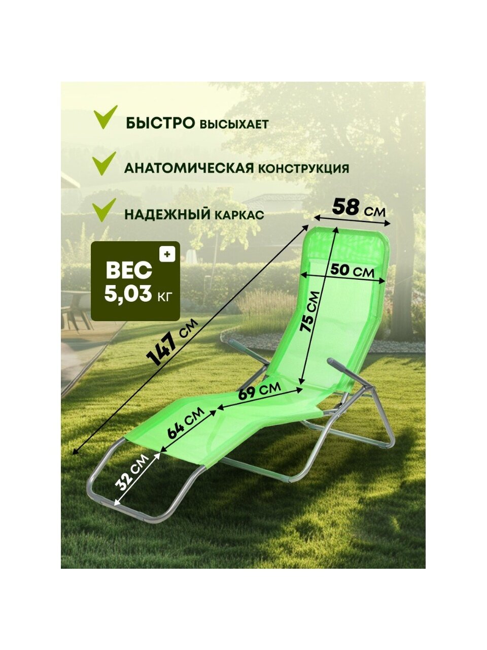 Анатомическая форма сиденья шезлонга обеспечивает прекрасную поддержку спины и ног, а подлокотники облегчат процесс вставания. Сиденье сделано из сетчатого материала плотного плетения устойчивого к ультрафиолетовому излучению и образованию плесени, а также не впитывает влагу, пропускает воздух и благодаря этим свойствам быстро просыхает.
