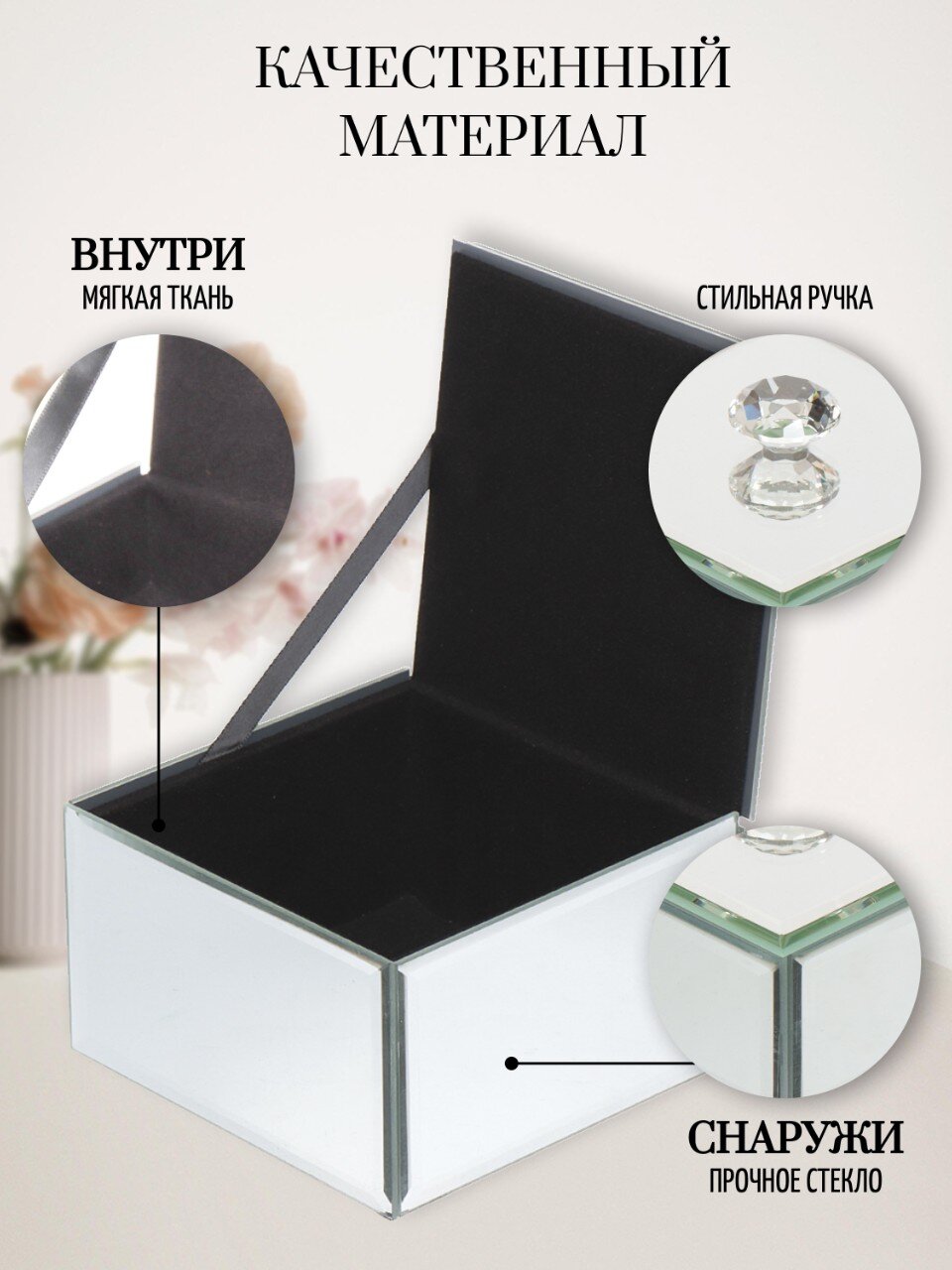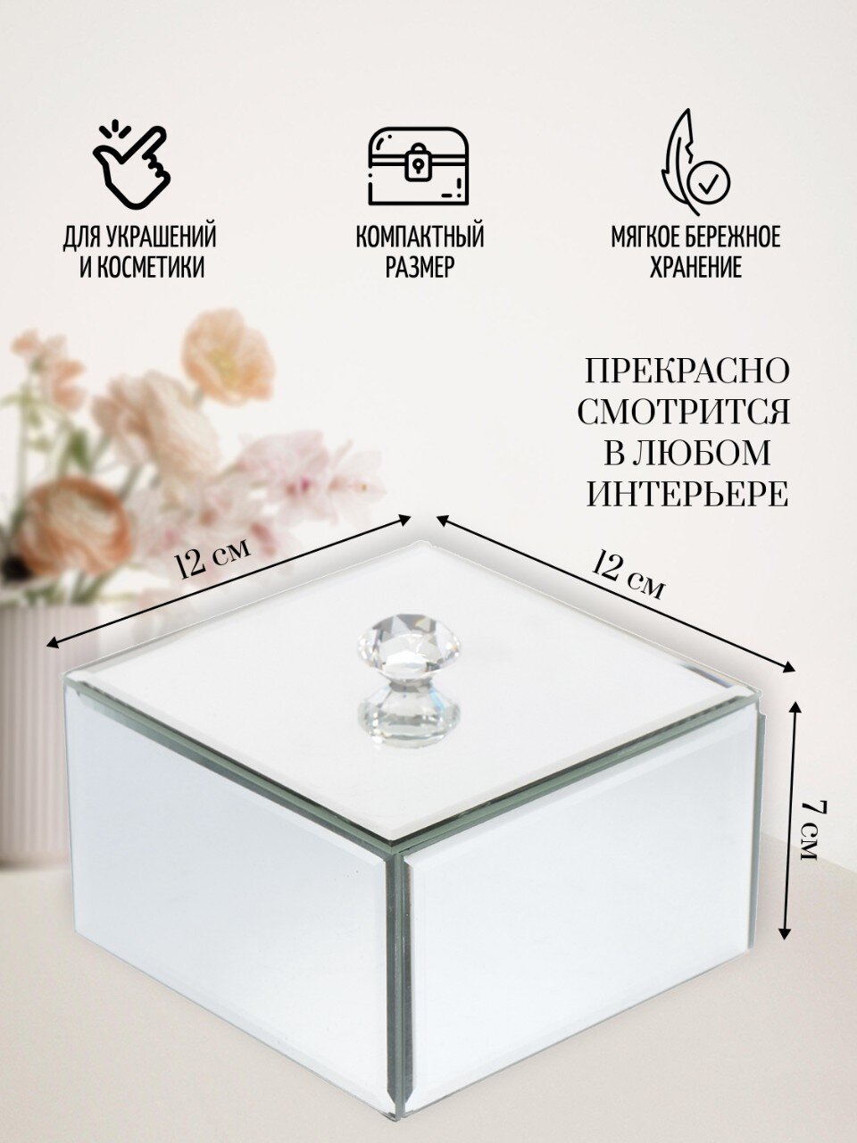 Великолепная шкатулка не оставит равнодушной ни одну любительницу изысканных вещей. Сочетание оригинального дизайна и функциональности сделает такую шкатулку практичным, стильным подарком и предметом гордости ее обладательницы.Шкатулка имеет полностью зеркальную поверхность (кроме дна и внутренней части).