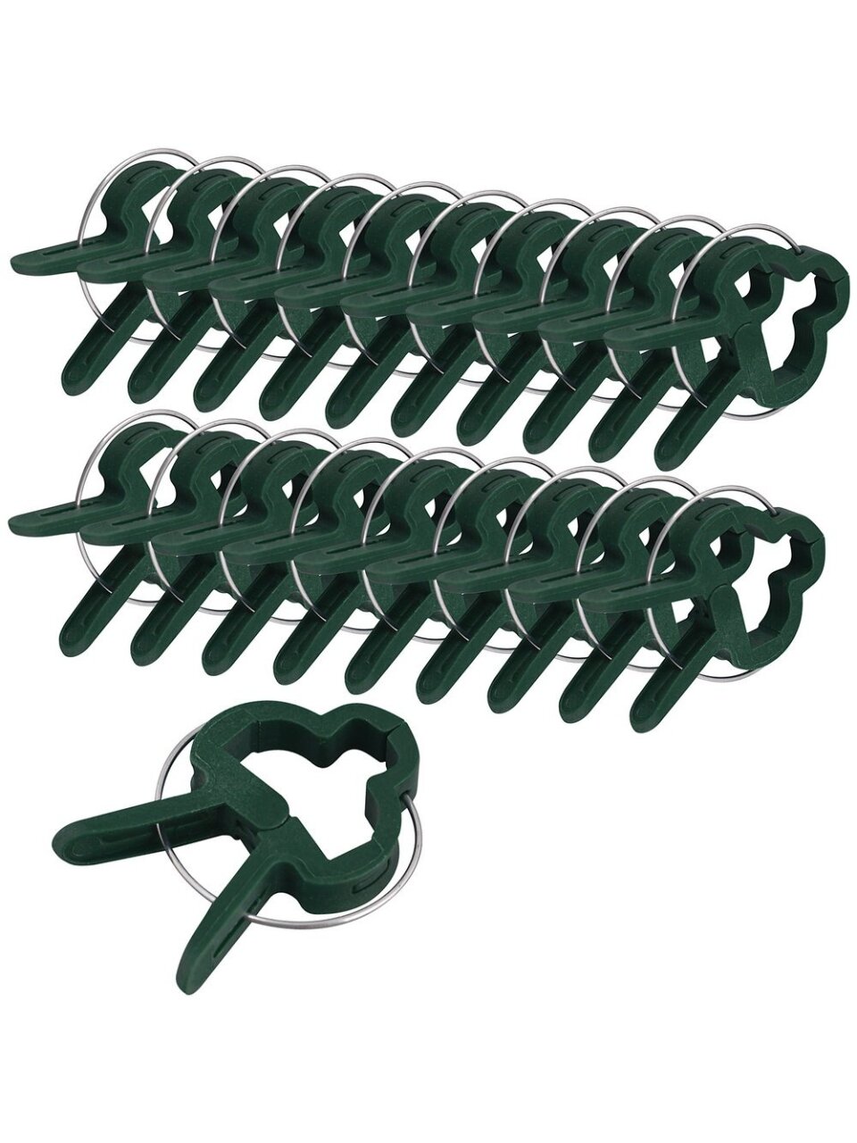 В комплекте 20 пластиковых зажимов зеленого цвета, бренд Мультидом, неразборная конструкция, размер 3х4х0.7 см.