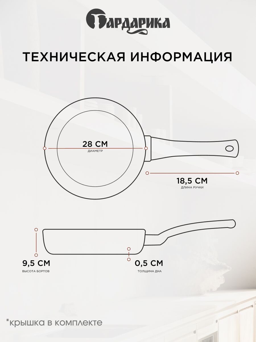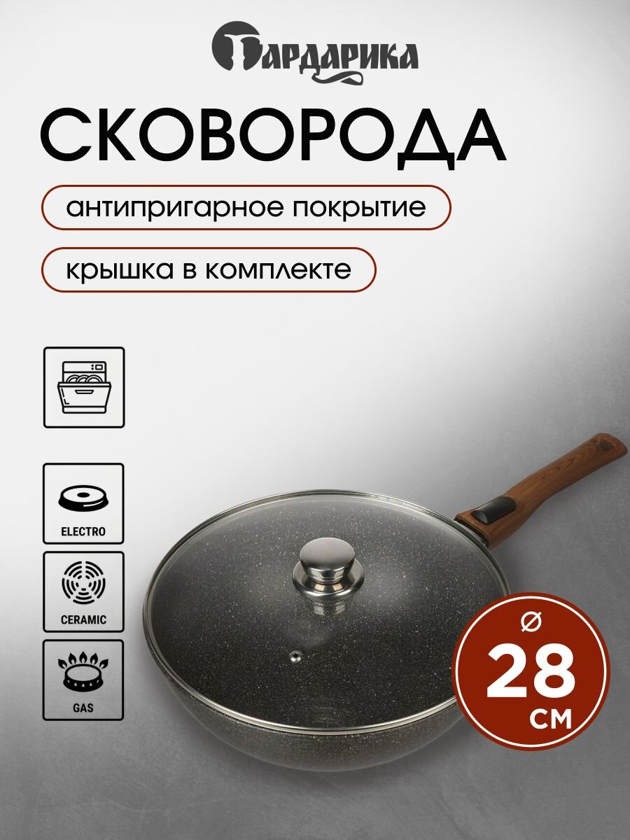 Сковорода-вок Гардарика Мегалит 18, 28 см: антипригарное гранитное покрытие, литой алюминий, крышка и съемная ручка — идеальный выбор для кухни и дачи.